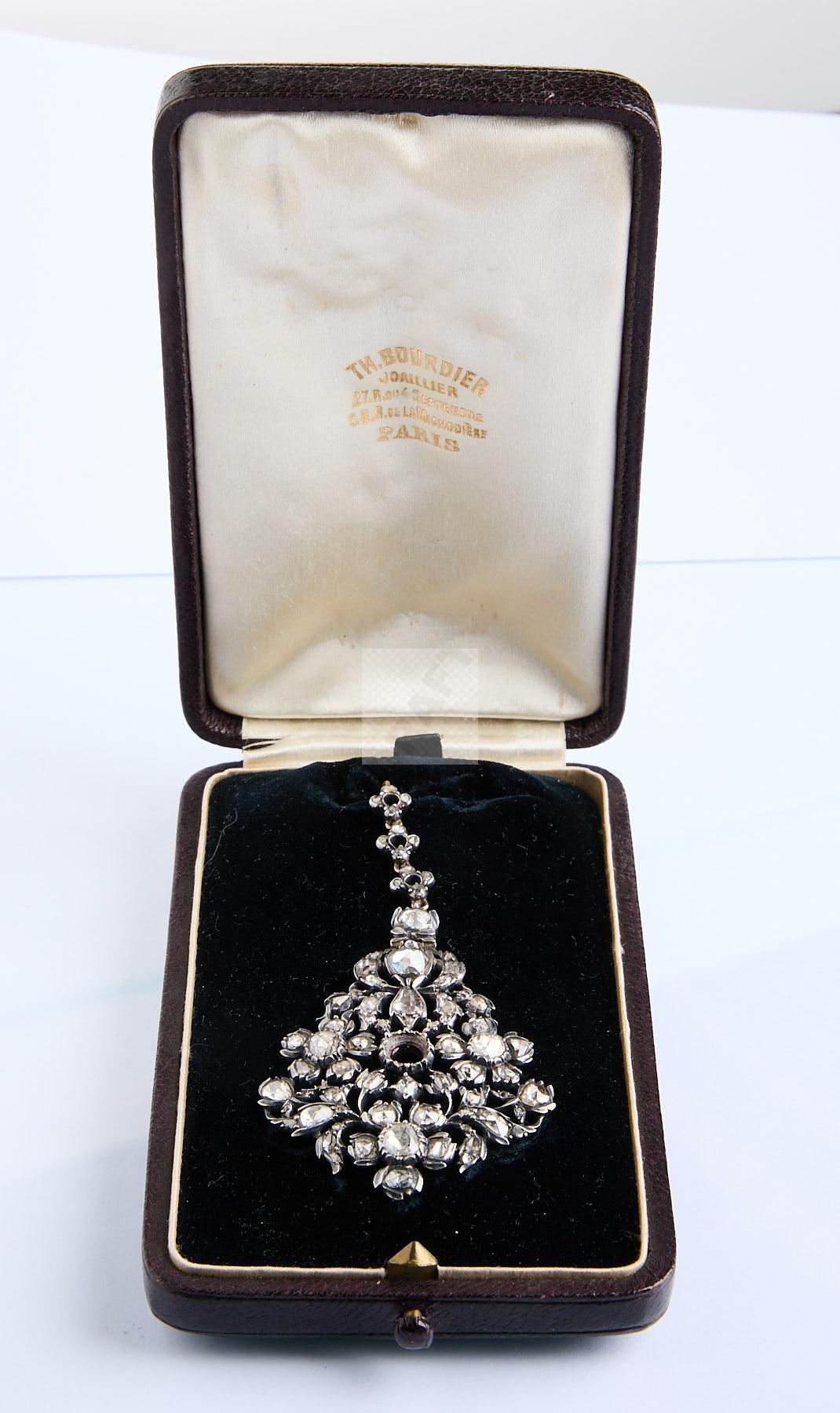 305 Pendentif en argent d’époque XVIII° serti de roses de diamants sur clinquant , manque la barrette de support et quatre diamants dont la pierre de centre. poids 21,7 g dans un écrin en forme de Th Bourdier Joaillier à Paris 1203
