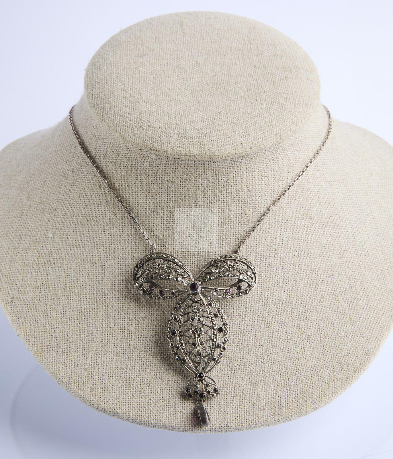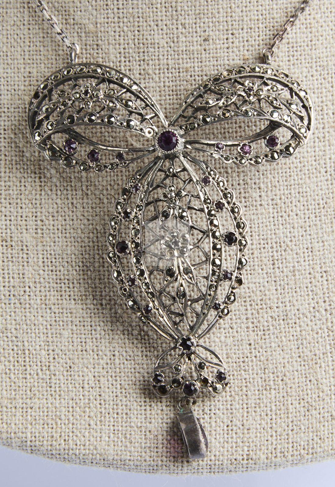 315 Collier pendentif en argent à décor de noeuds serti de marcassites et de pierres mauves.