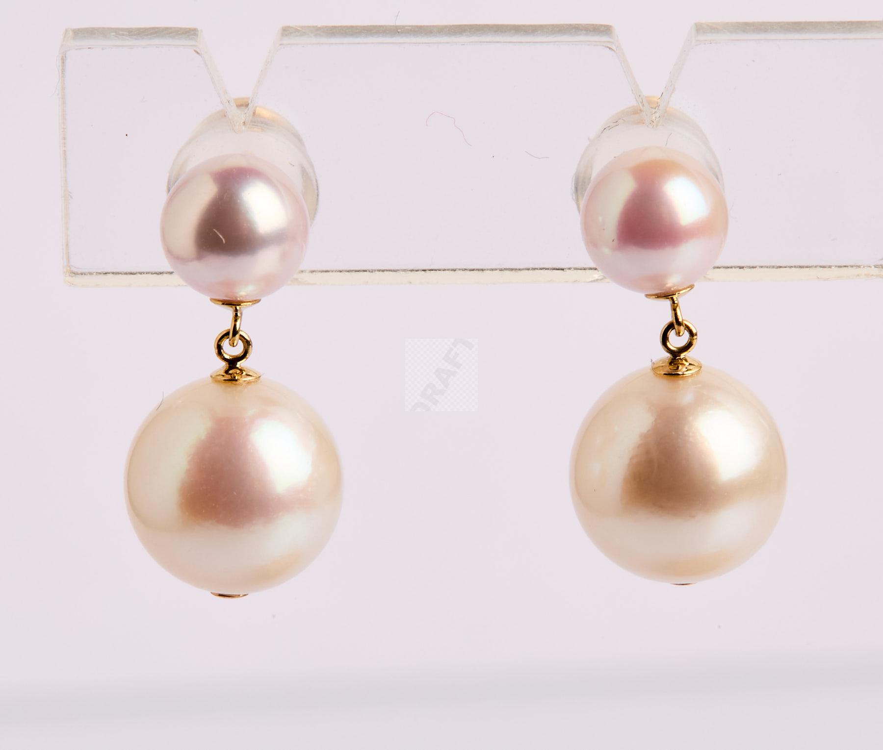 325 Paire de pendants d’oreilles en or jaune 750/1000 srtie de deux perles de culture 8.5 mm surmontées de deux perles de culture rosées de dimension 5.5 mm. Fermoirs siliconés en or. 2.8g