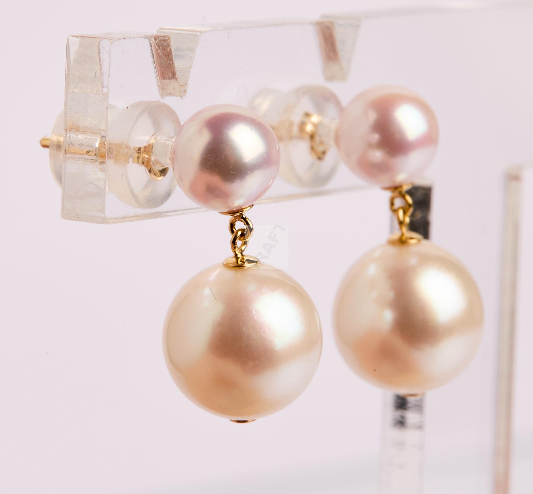 Lot n°325 - 325 Paire de pendants d’oreilles en or jaune 750/1000 srtie de deux perles de cu