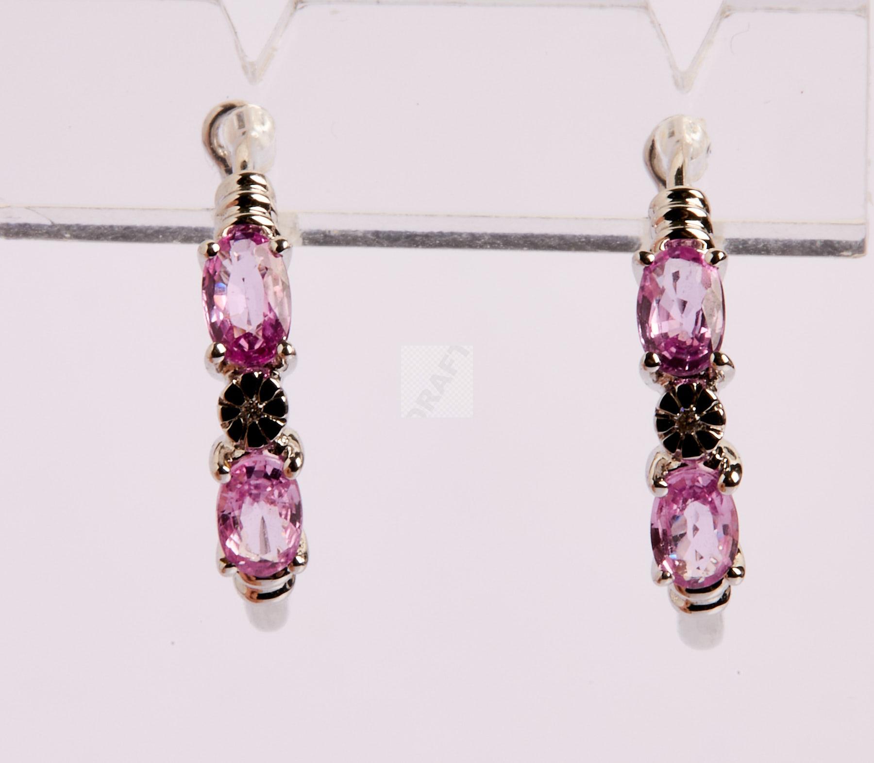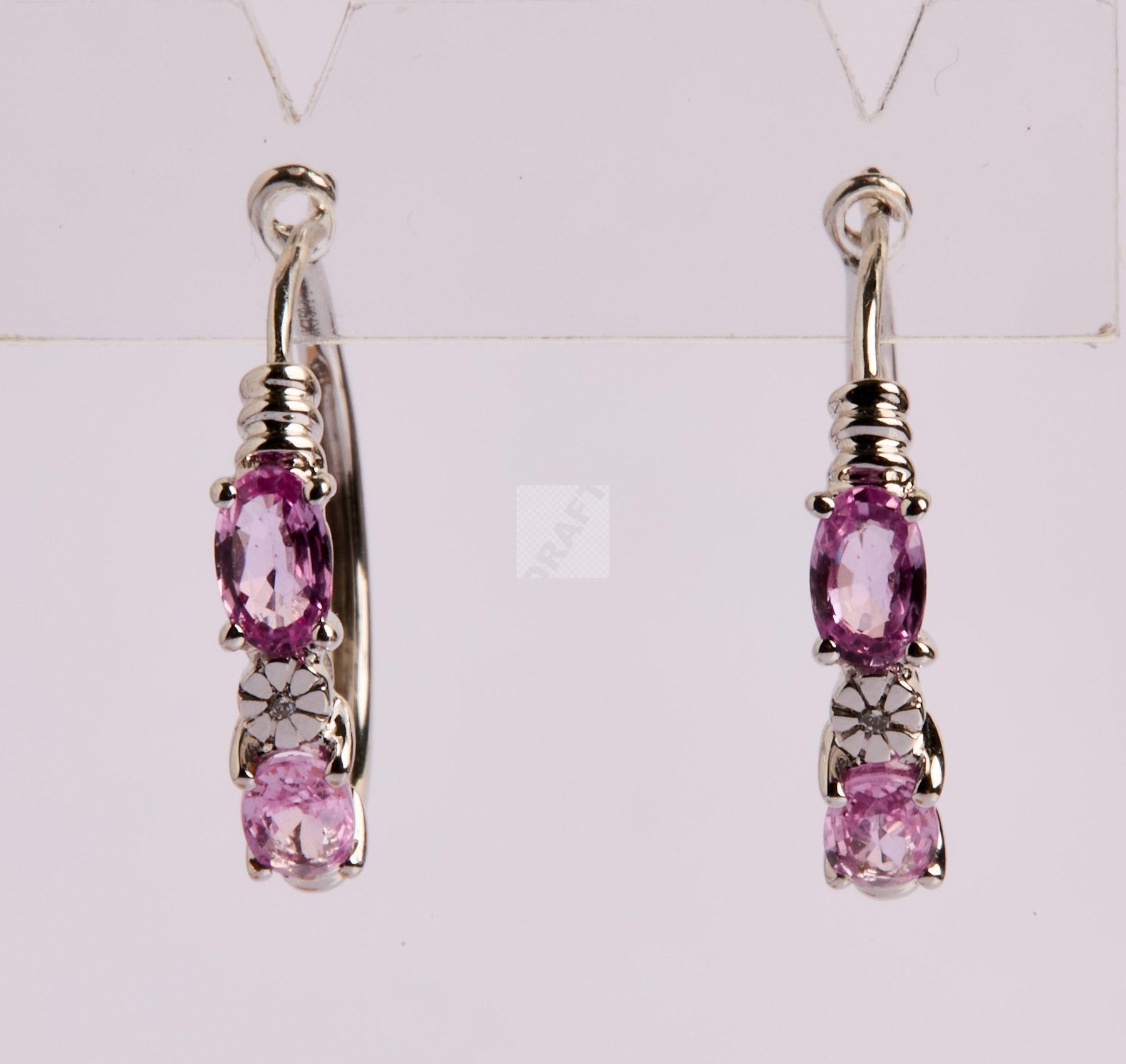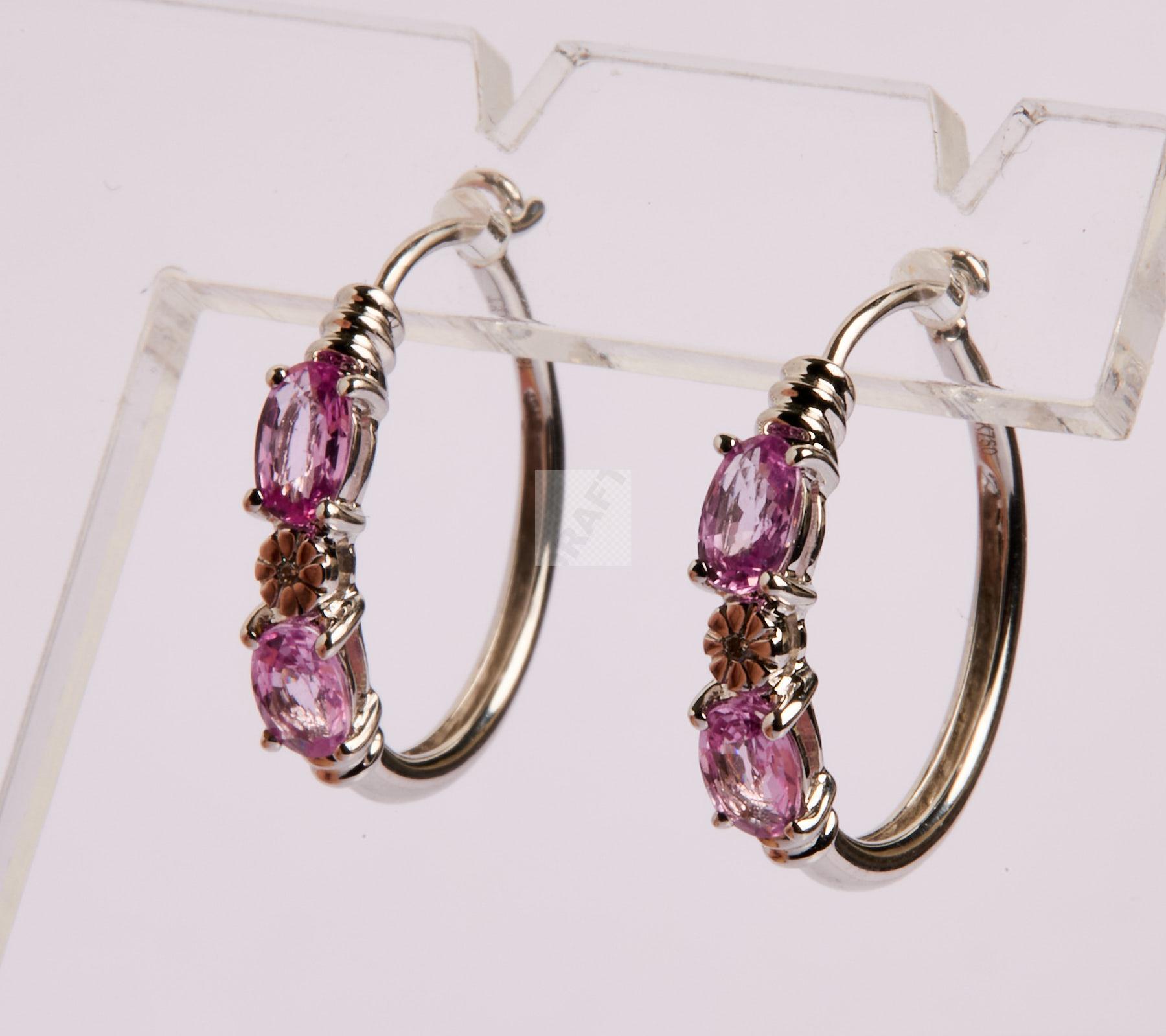 332 Paire de créoles en or blanc 750/1000 sertie de 4 saphirs roses totalisant environ 1.15 carat agrémentés de 2 diamants ronds pour environ 0.10 carat.