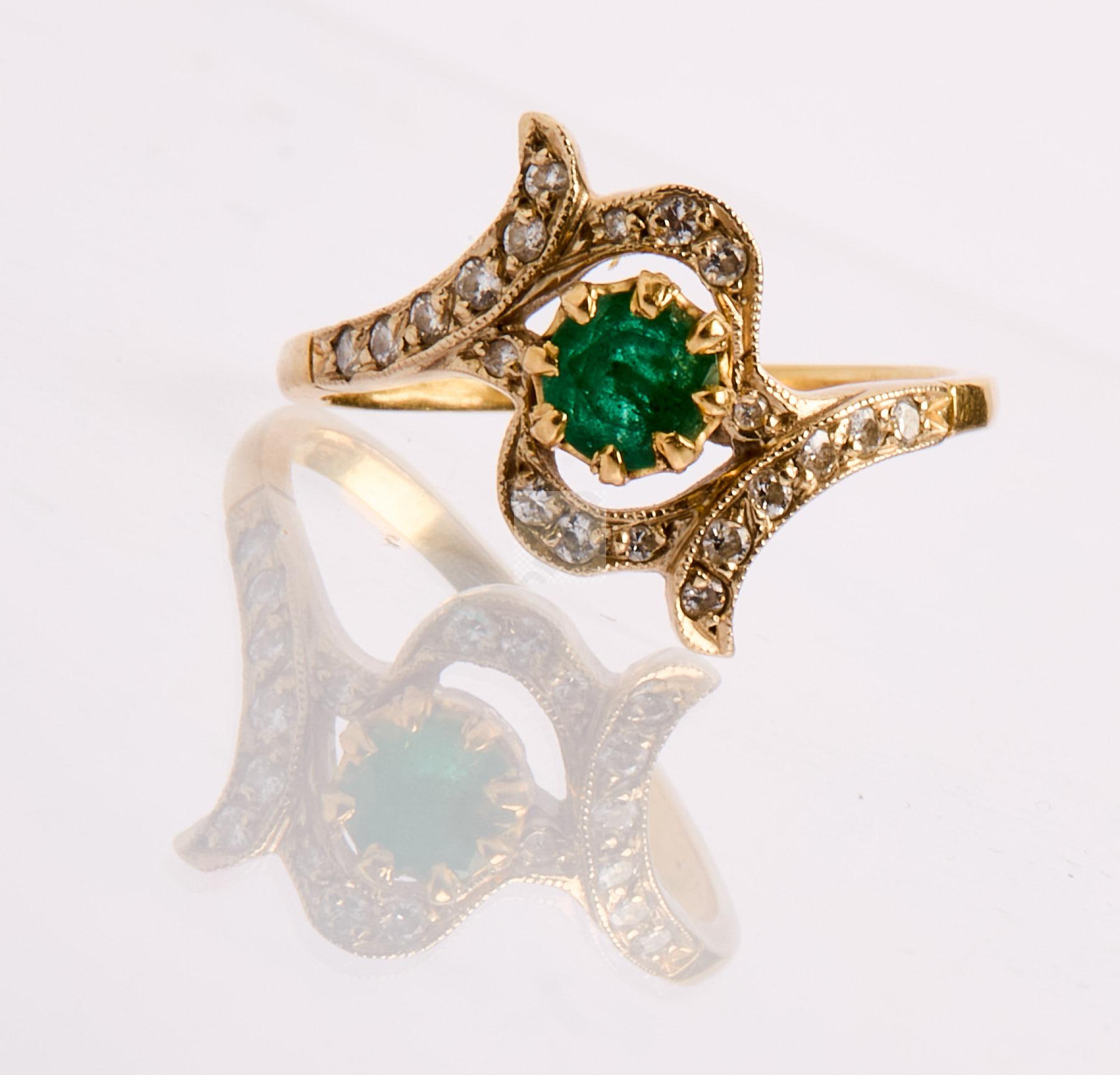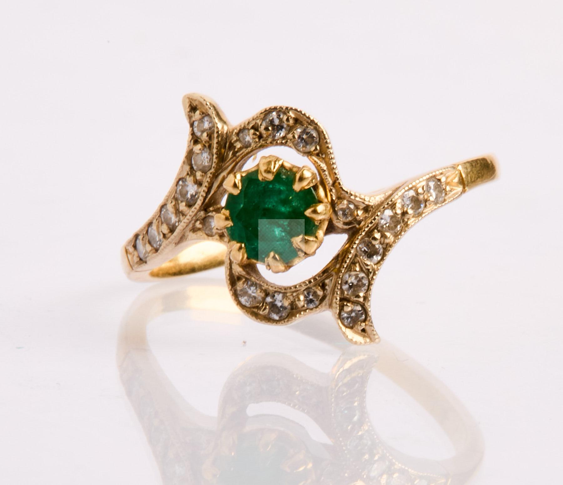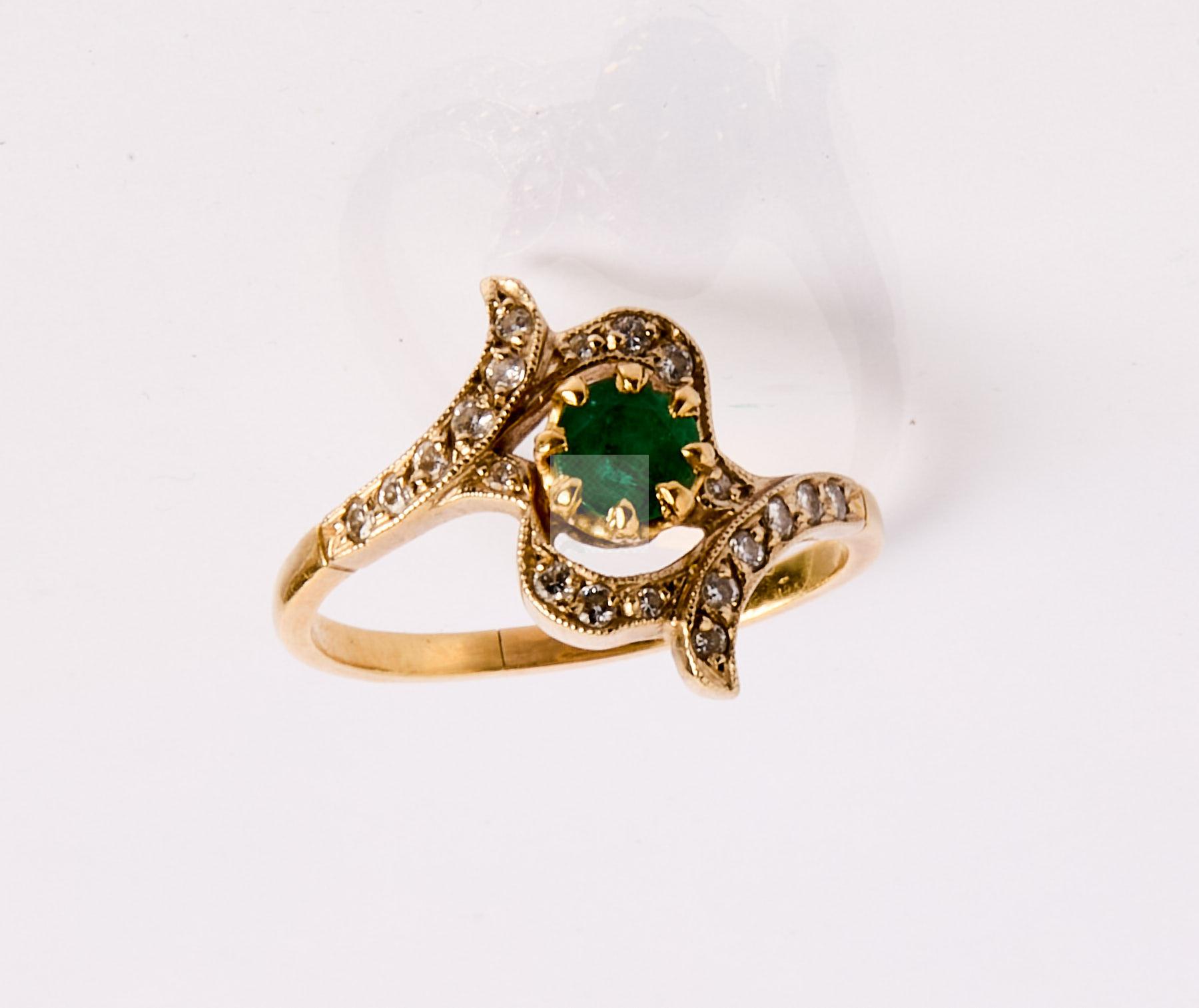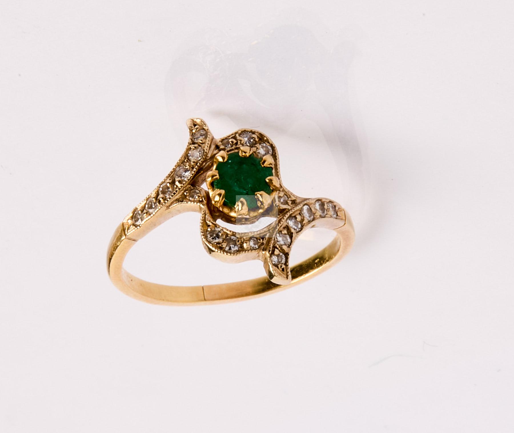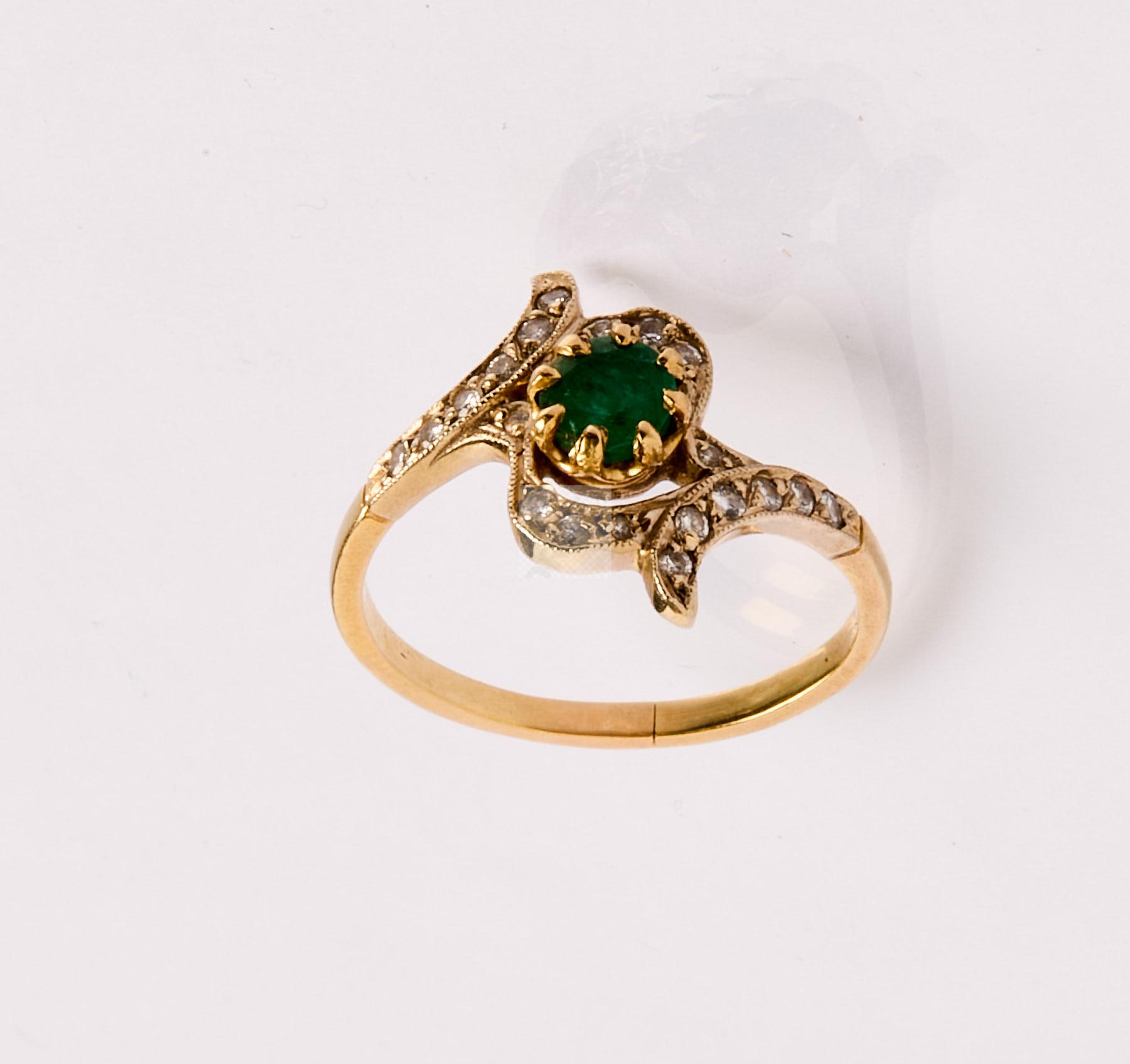 333 Bague tourbillon en or jaune 750 ‰ sertie d’une petite émeraude ronde dans un entrelacs de diamants taille 8/8, tour de doigt 56 1/2, poids 3,70 g écrin Yves Flahaut à Arras