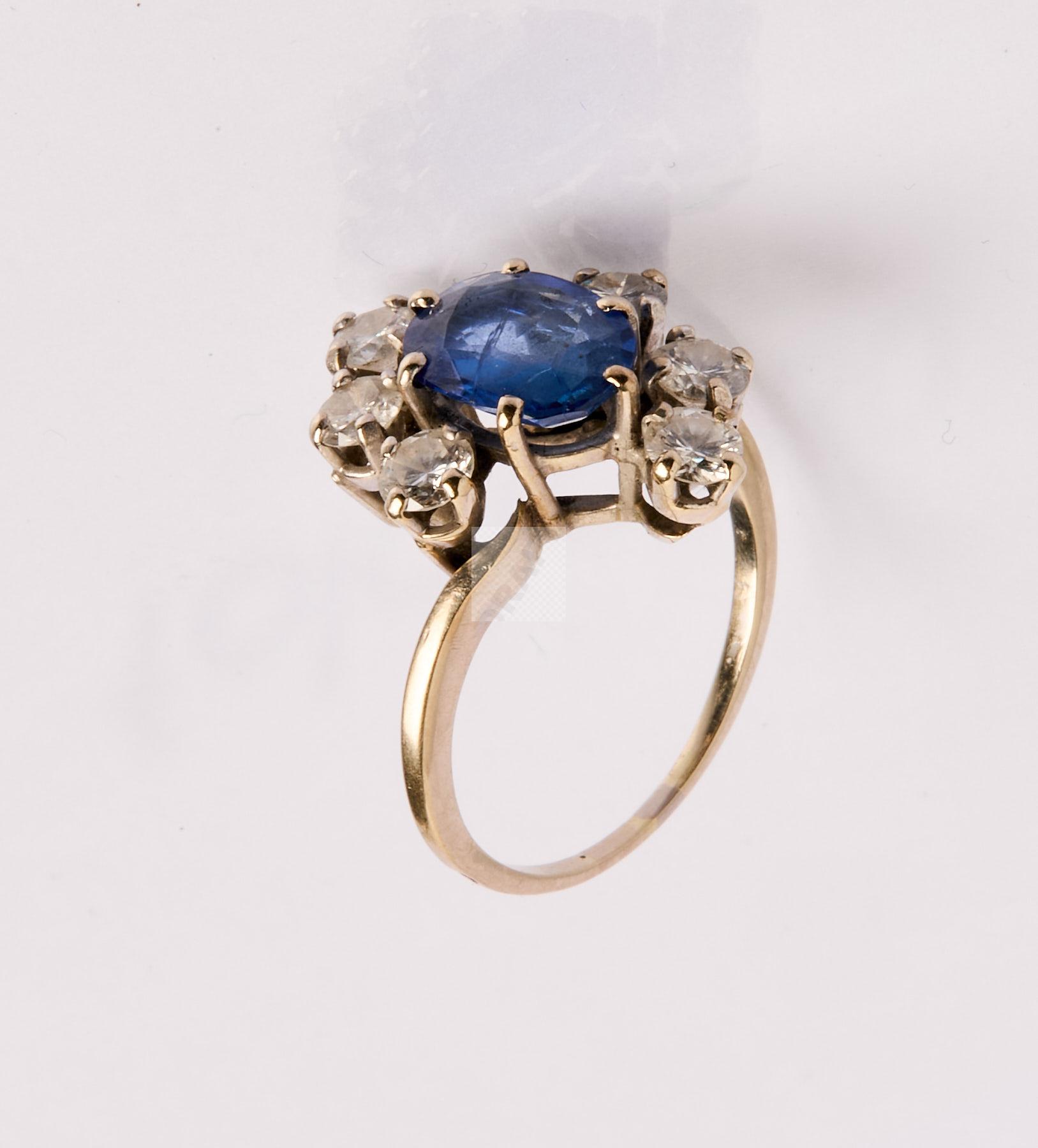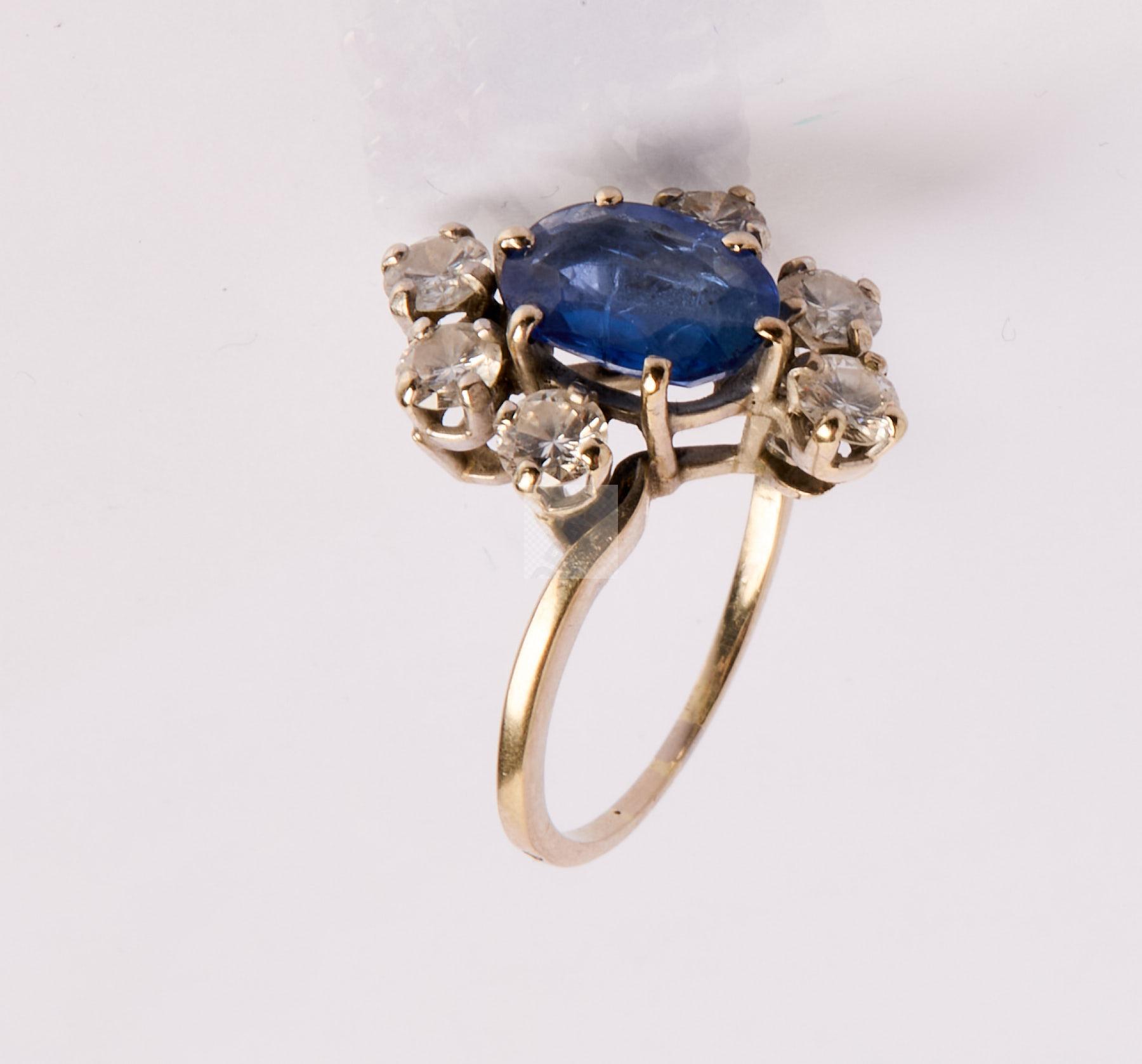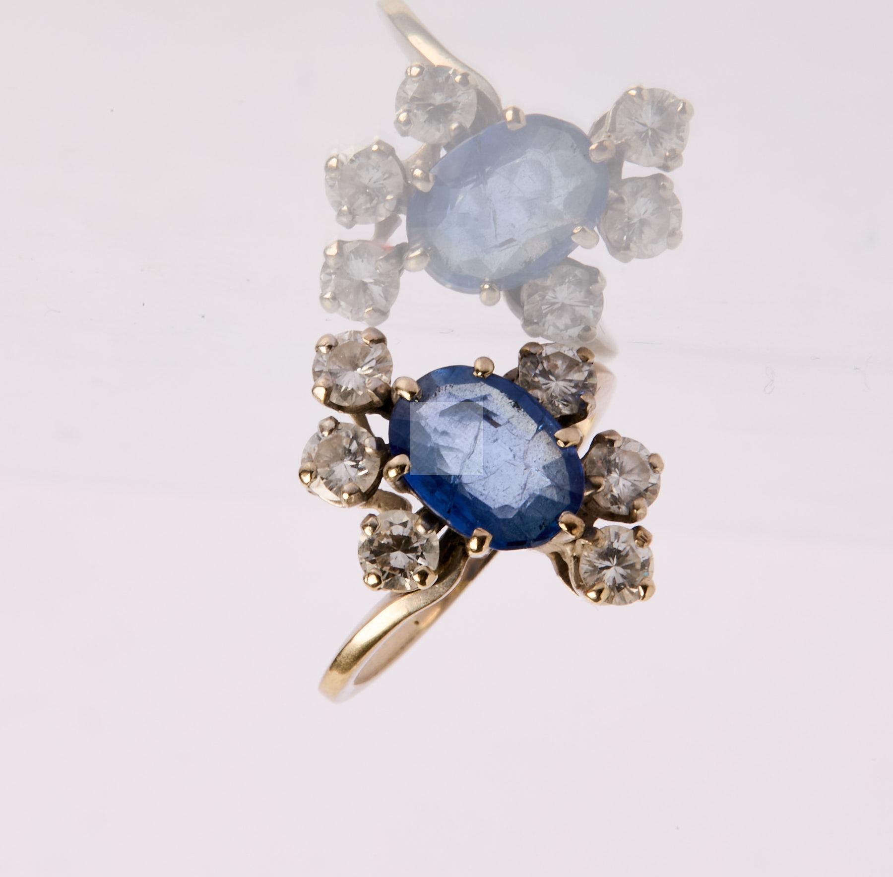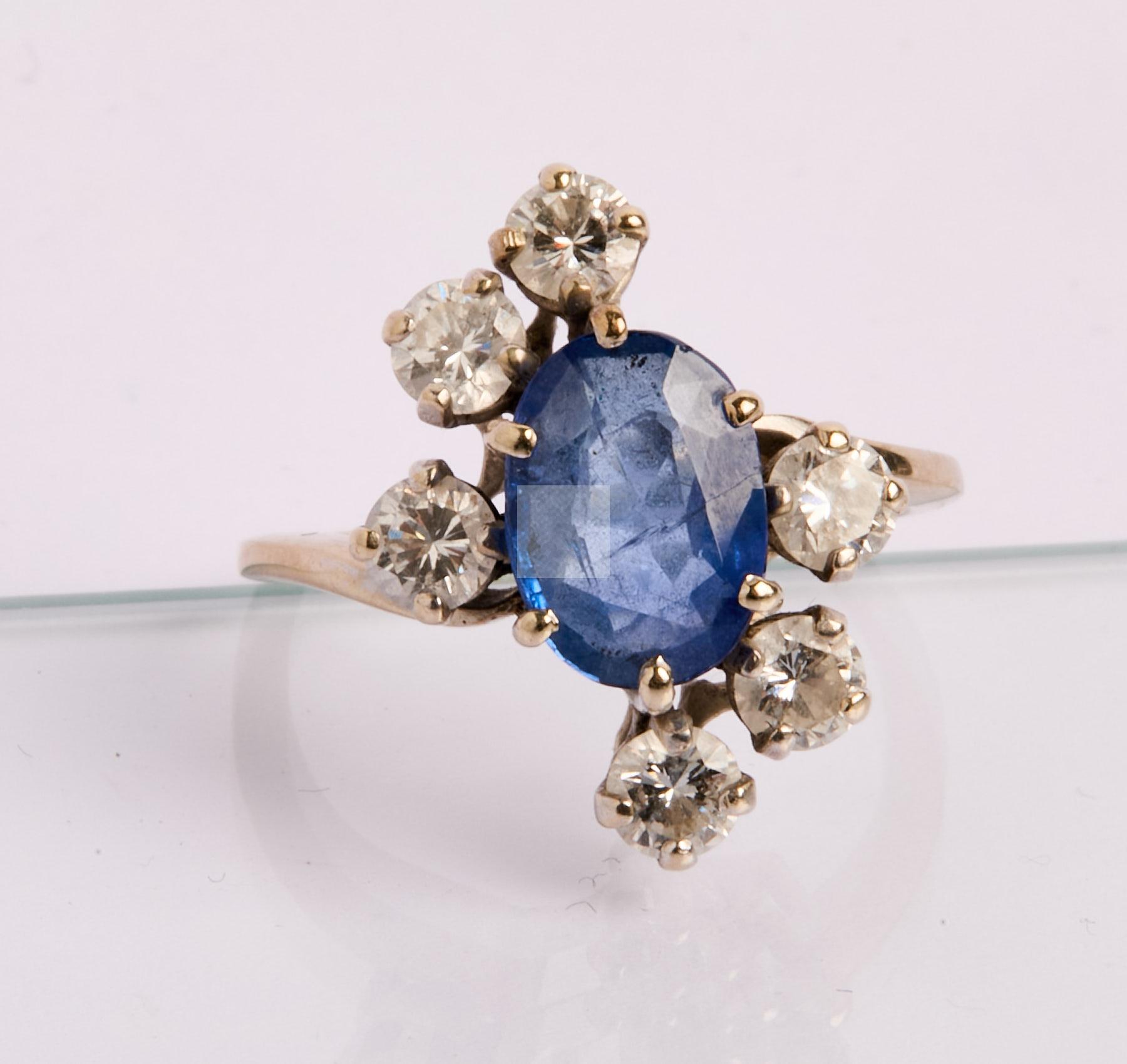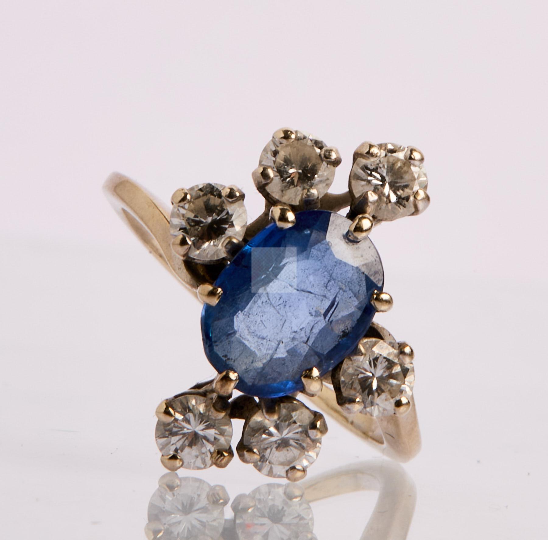 335 BRAUN : Bague en or gris 750 ‰ sertie en tourbillon d’un saphir ovale d’un poids estimé à 2 ct et 6 diamants brillantés de taille moderne totalisant environ 1,20 ct, tour de doigt 54 1/2, poids 4,76 g