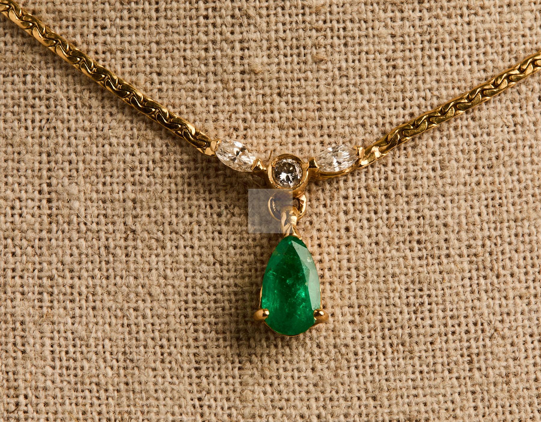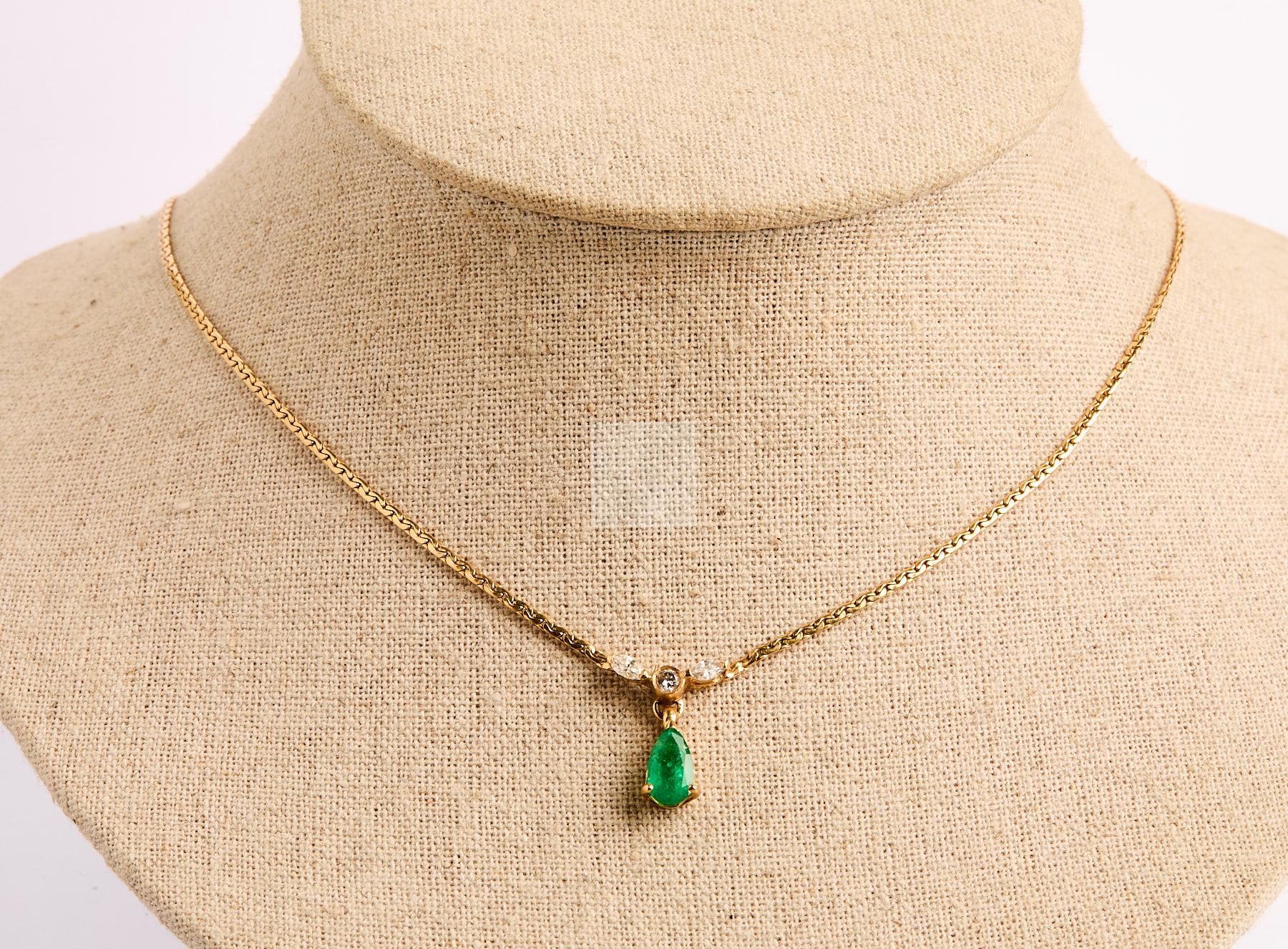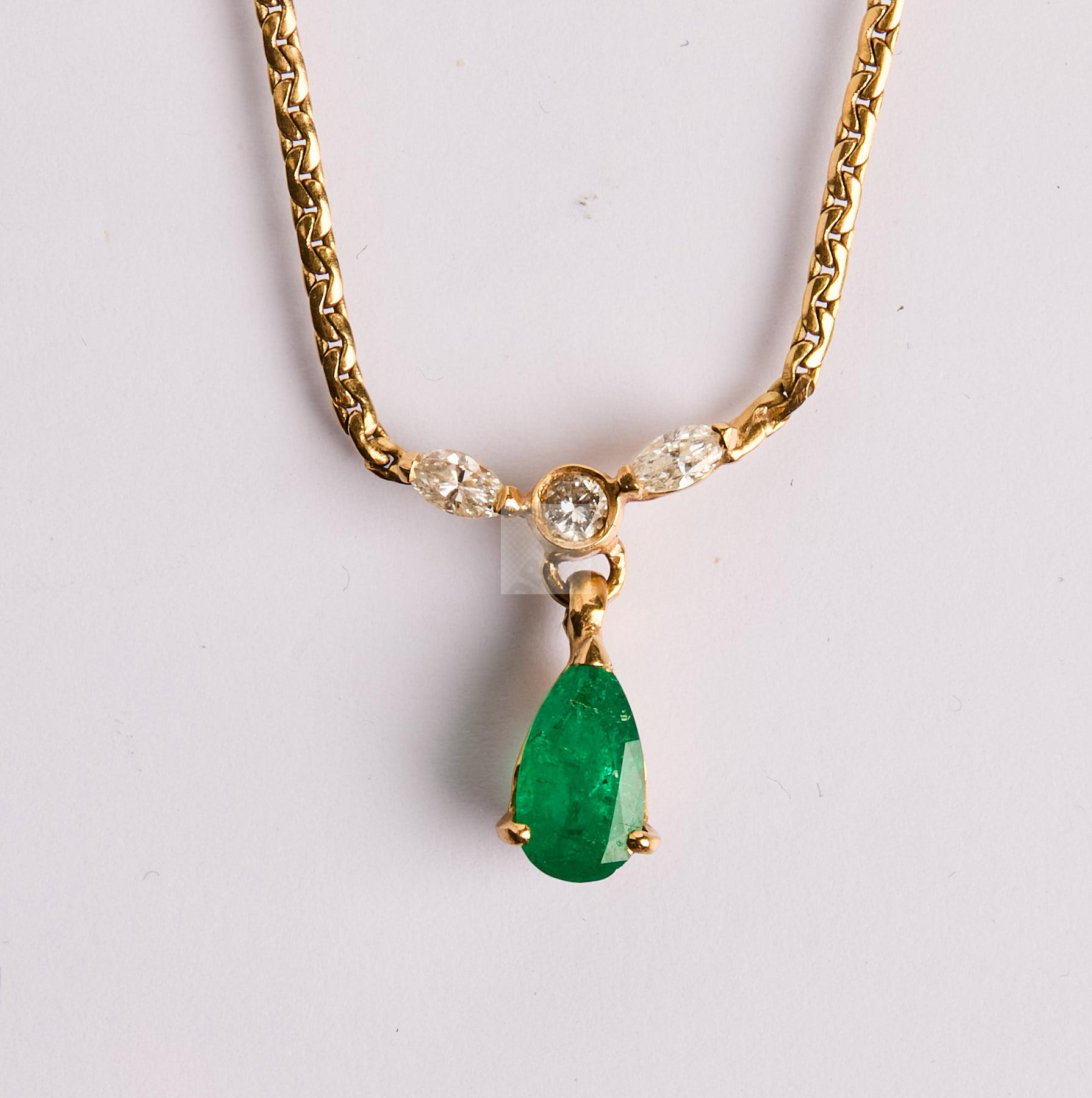 336 Collier en or jaune 750 ‰ orné d’une goutte d’émeraude d’environ 1,20 ct soutenue d’un diamant rond et de deux diamants navettes, tour de cou 54 cm, poids 7,65 g