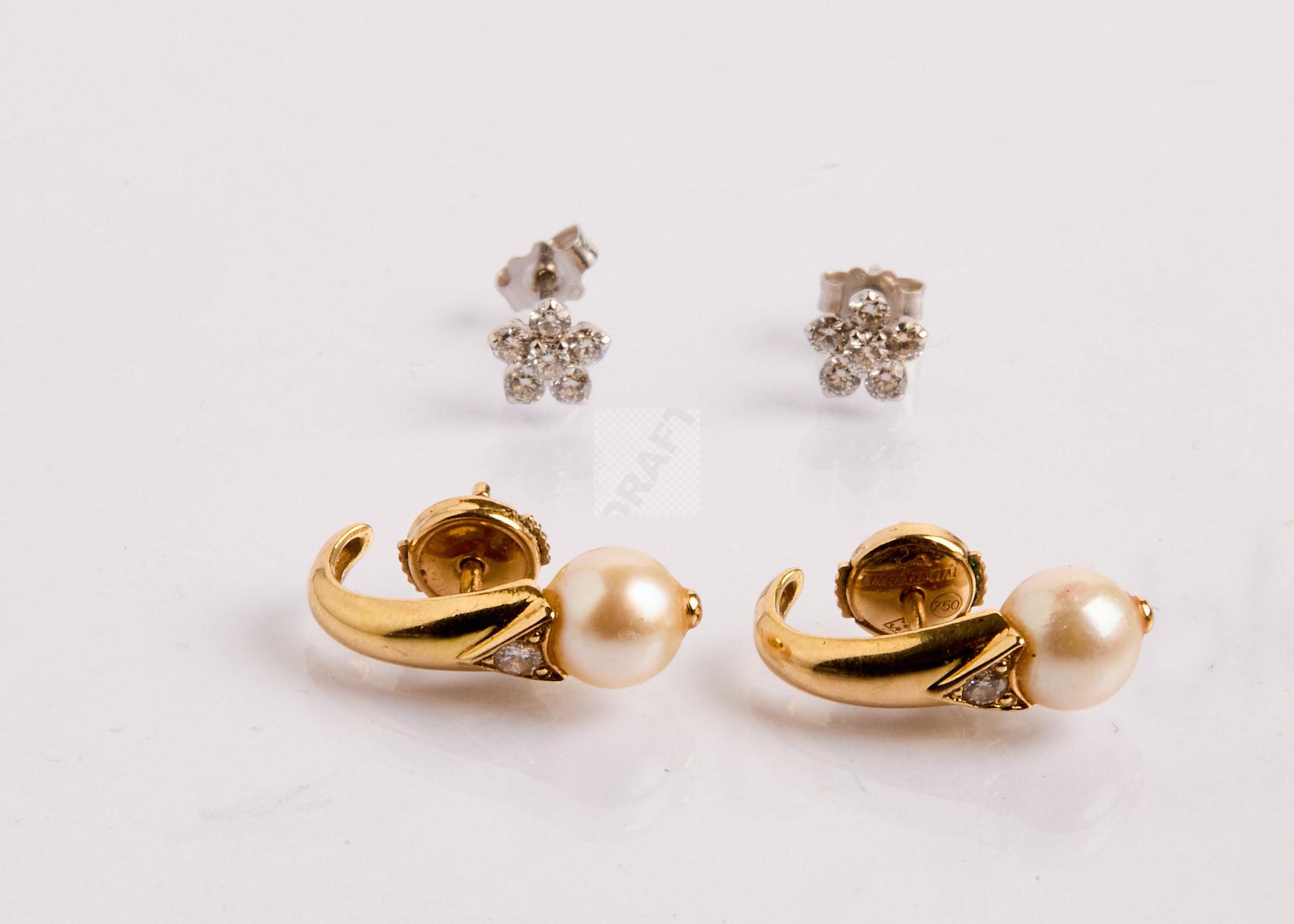348 Paire de clous d’oreilles fleurettes en diamants et or gris 750 ‰ sur poussettes belges, poids 0,8 g on joint une paire de clous d’oreilles corne d’or jaune 750 ‰ et perles de culture de 6,2 mm et petits diamants , poids brut 3,2 g