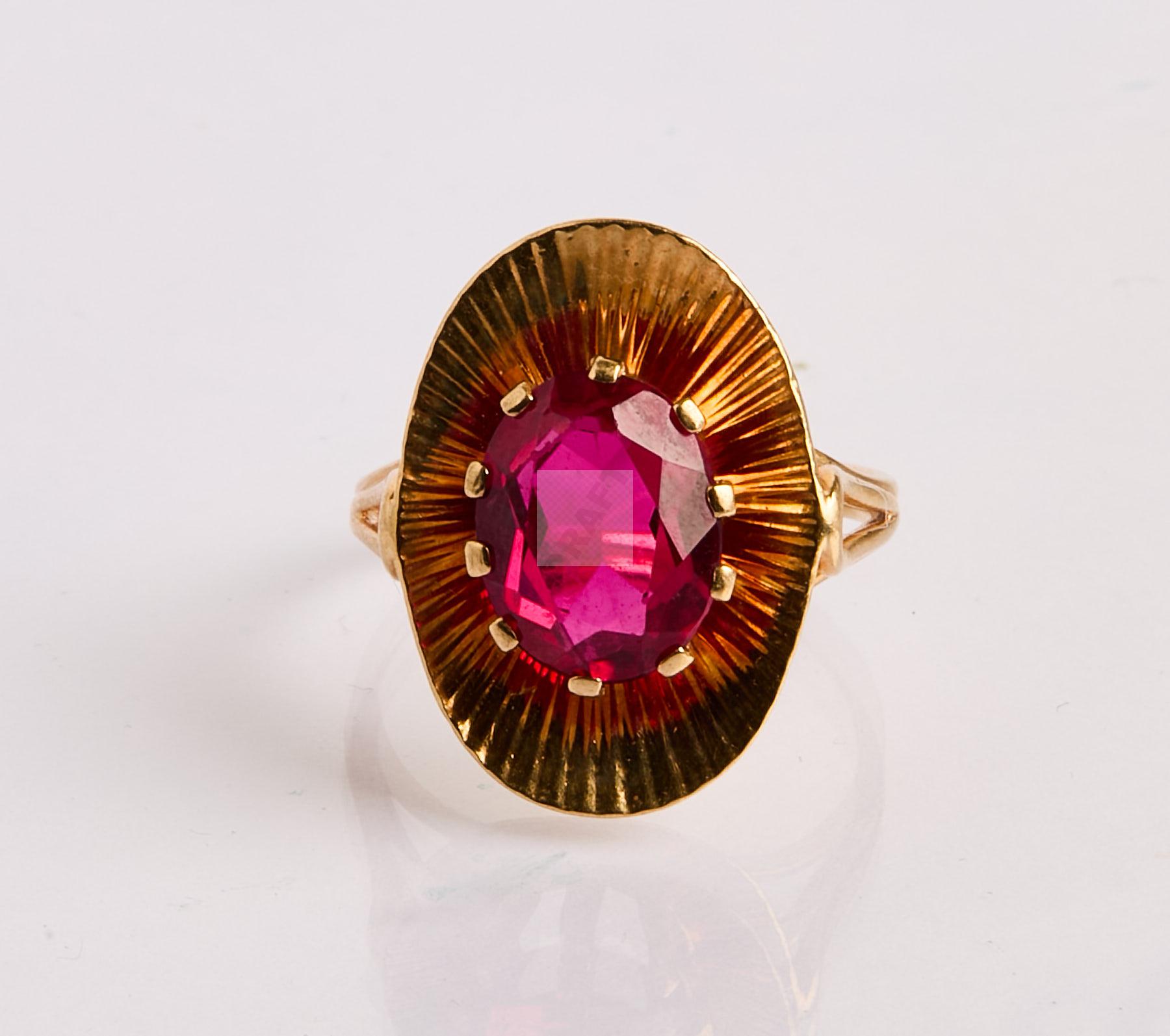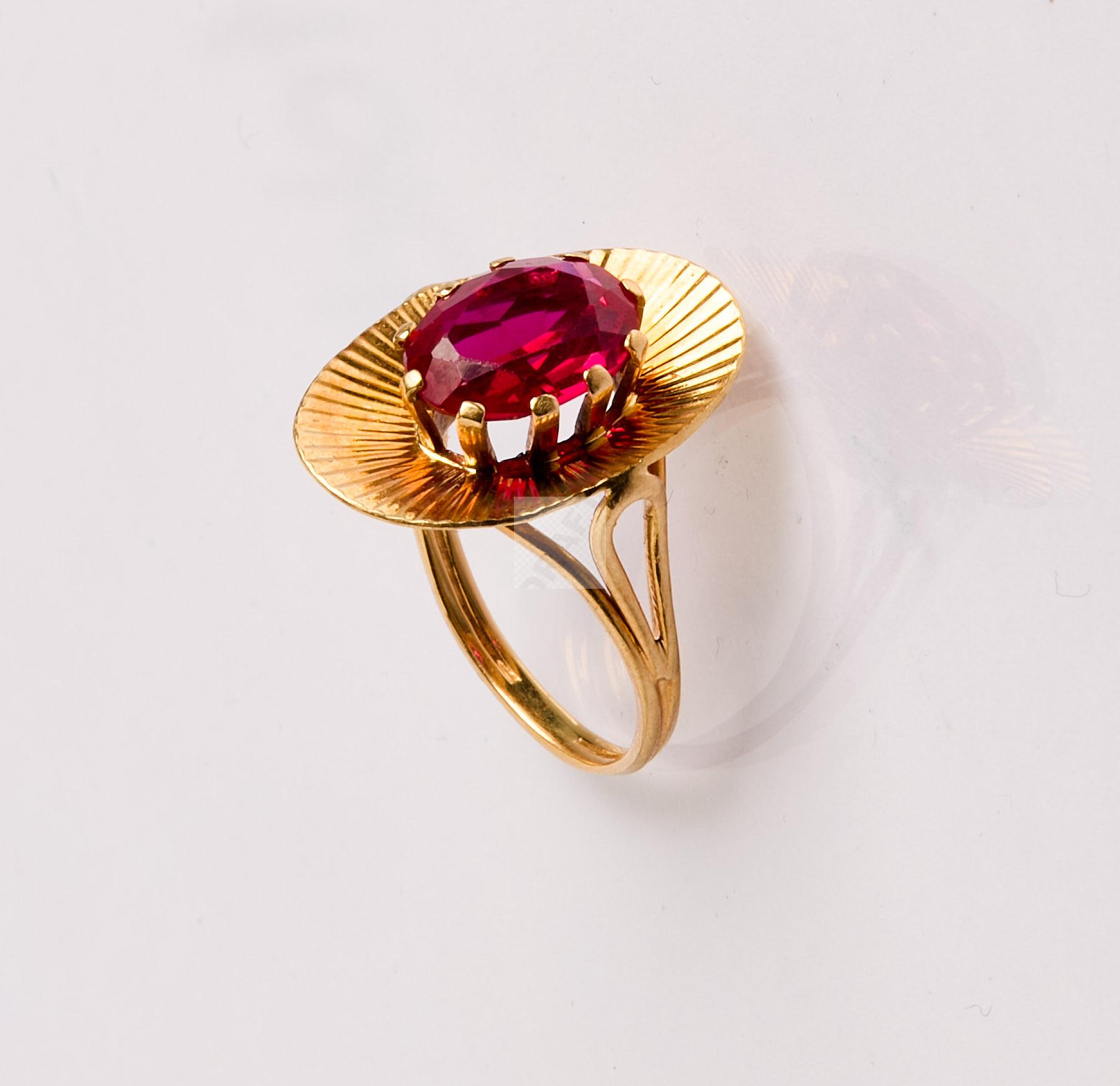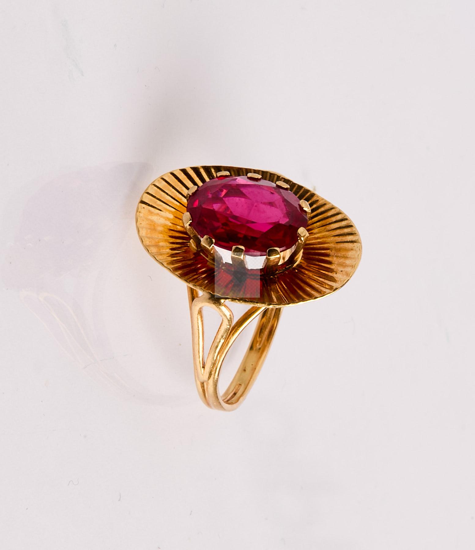 Lot n°352 - 352 Bague en or jaune 750/1000 sertie d’une pierre rouge, 4g brut.