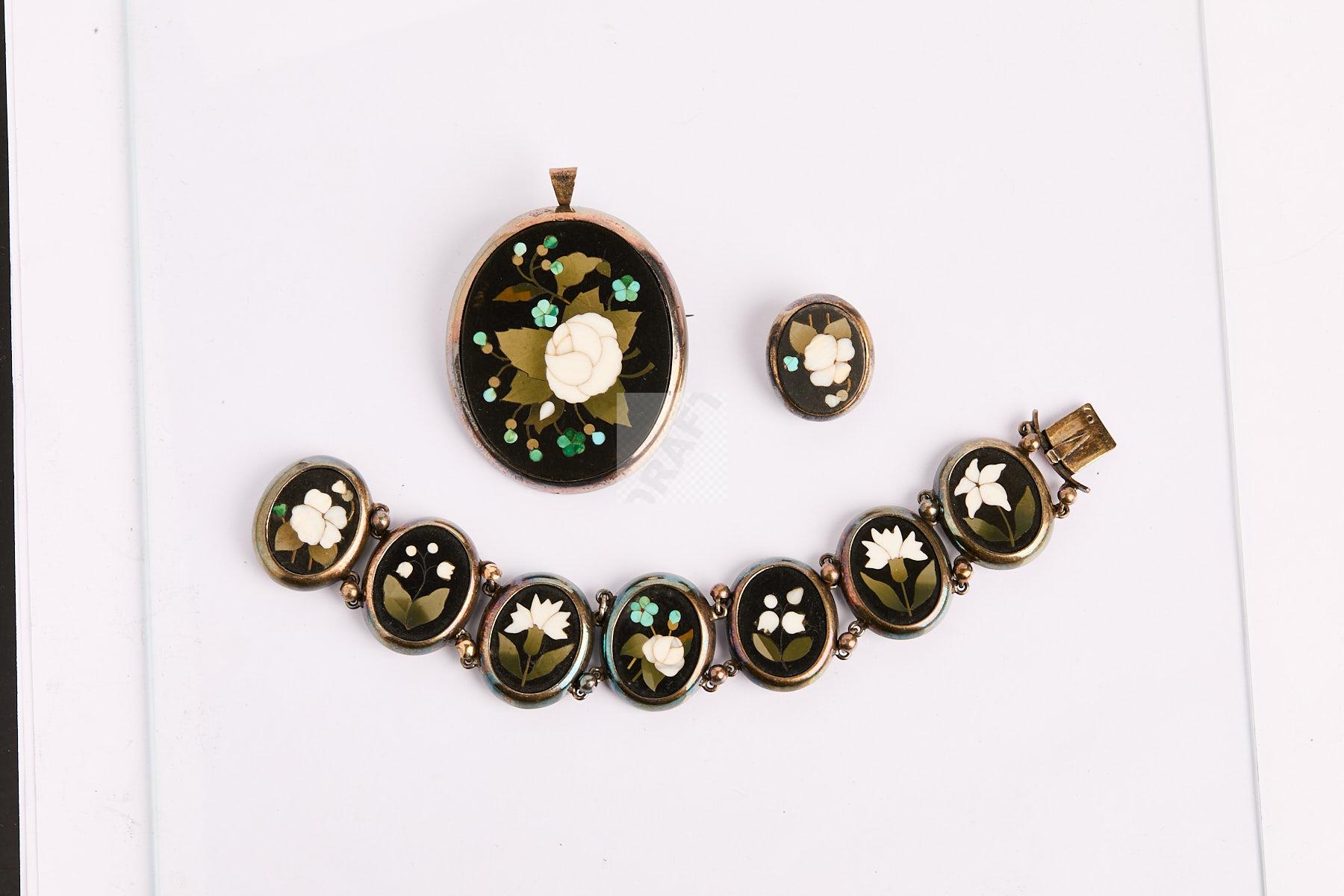 353 Parure en marqueterie de pierre dure à décor de fleurs épanouies composé d’un bracelet, un pendentif et un clip