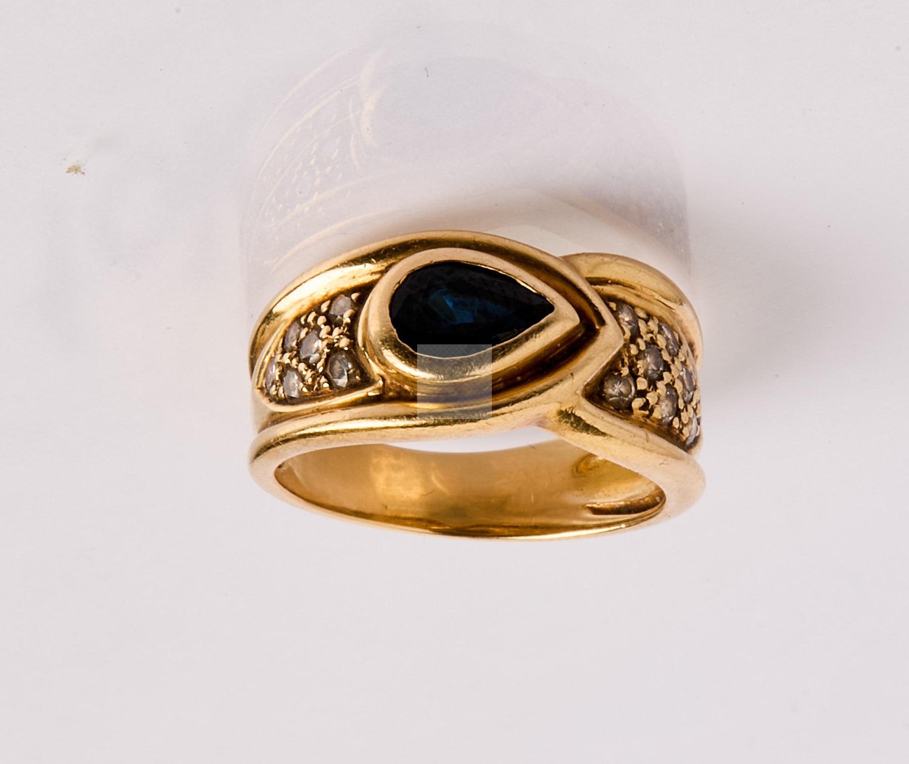 Lot n°359 - 359 Bague bandeau en or jaune sertie d’un saphir et de petits diamants, tour de