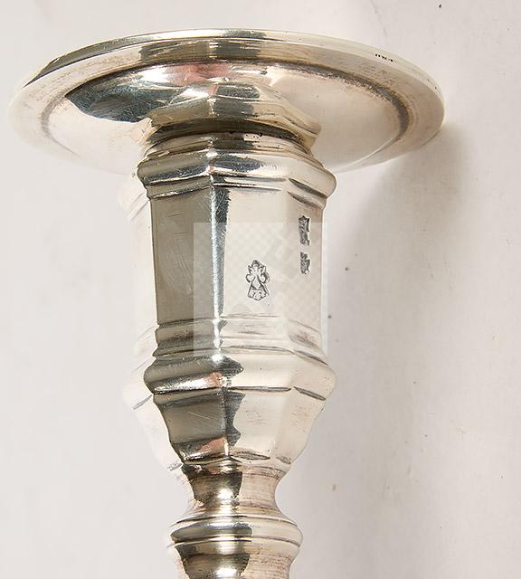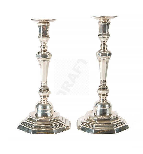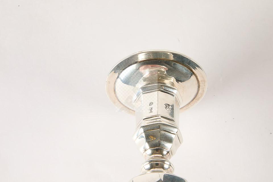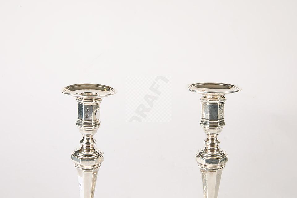 Lot n°7 - 7 Paire de bougeoirs en argent et leurs bobèches, les fûts en balustre à pans co