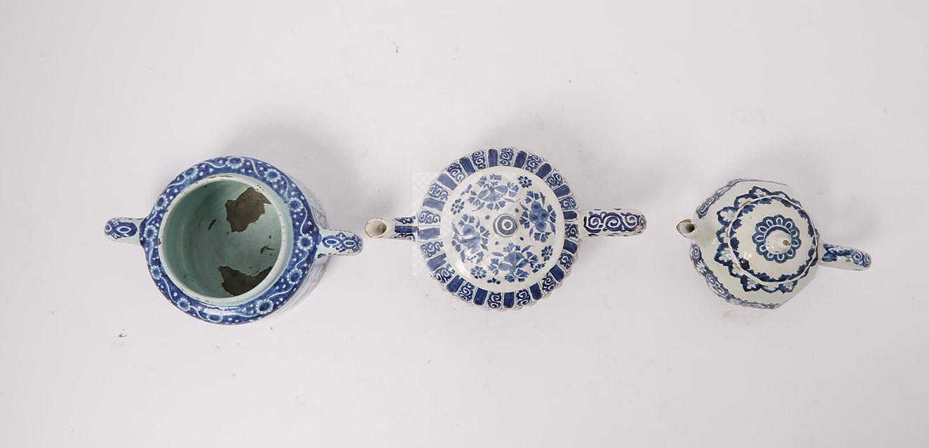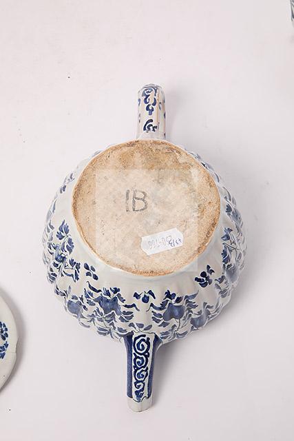 Deux théières et un vase bi-ansé en faïence camaïeu bleu à décor de lambrequins et branchages fleuris.