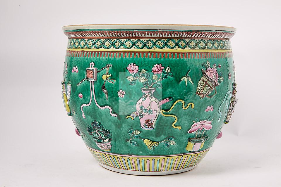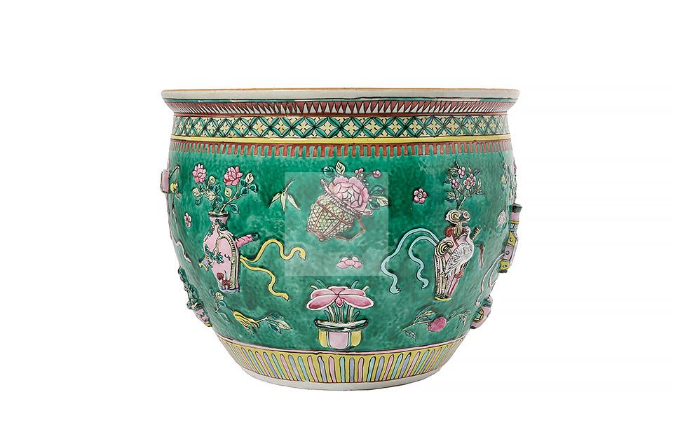 Bac à carpes en porcelaine poychrome à décor de vases en semi relief.
