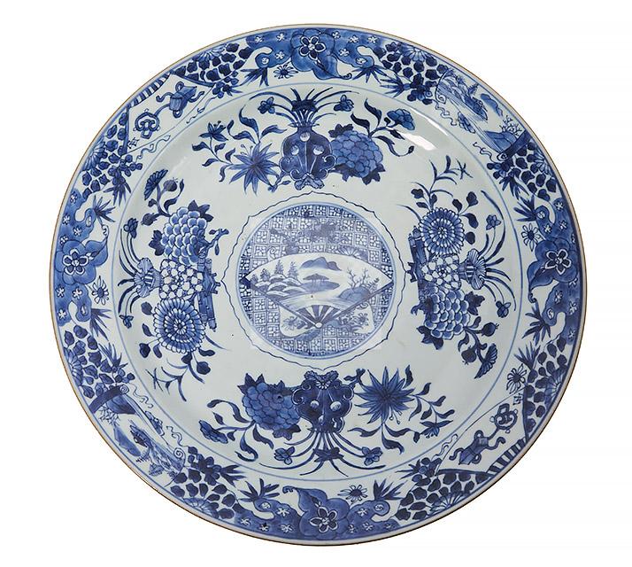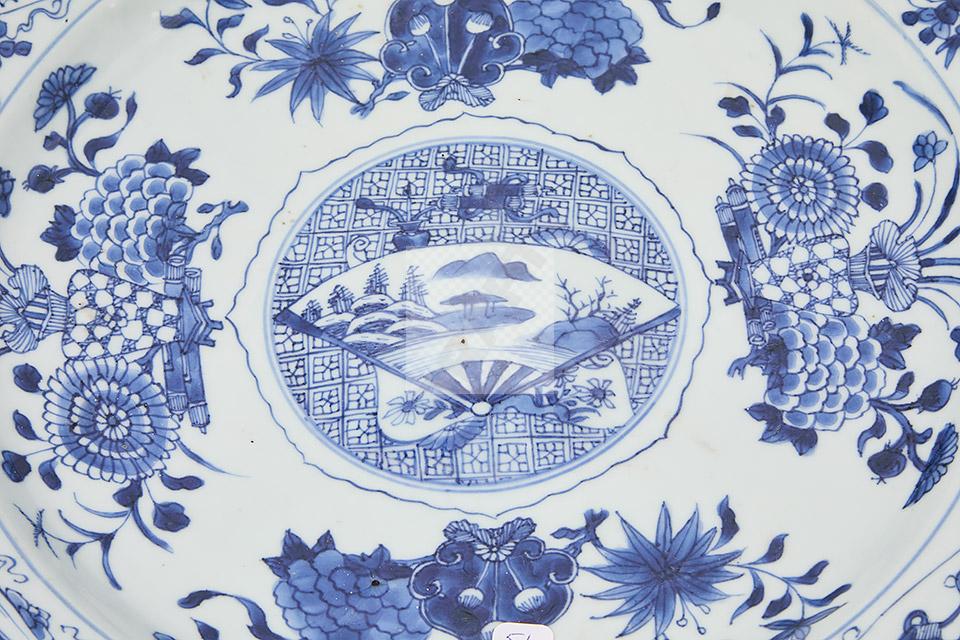 87 Plat en porcelaine de Chine camaïeu bleu à décor d’éventail et vase fleuri