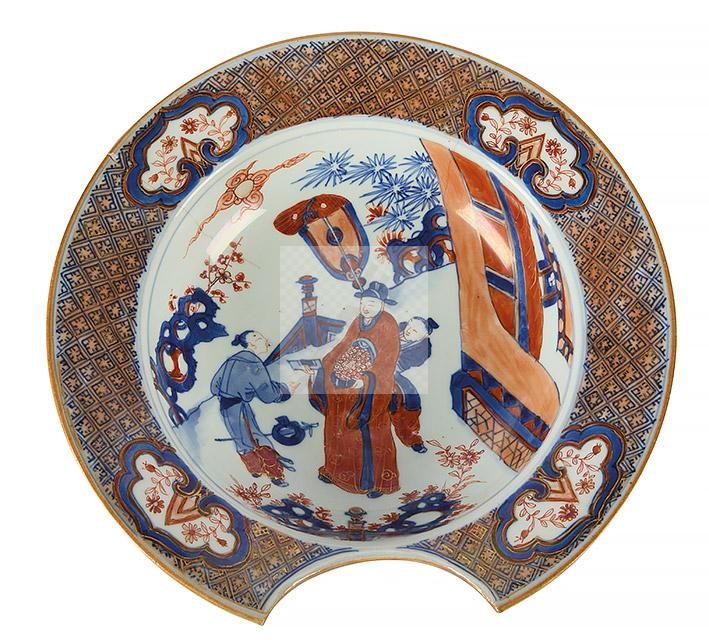 Plat à barbe en porcelaine polychrome à décor de scène de la vie quotidienne