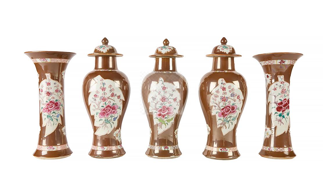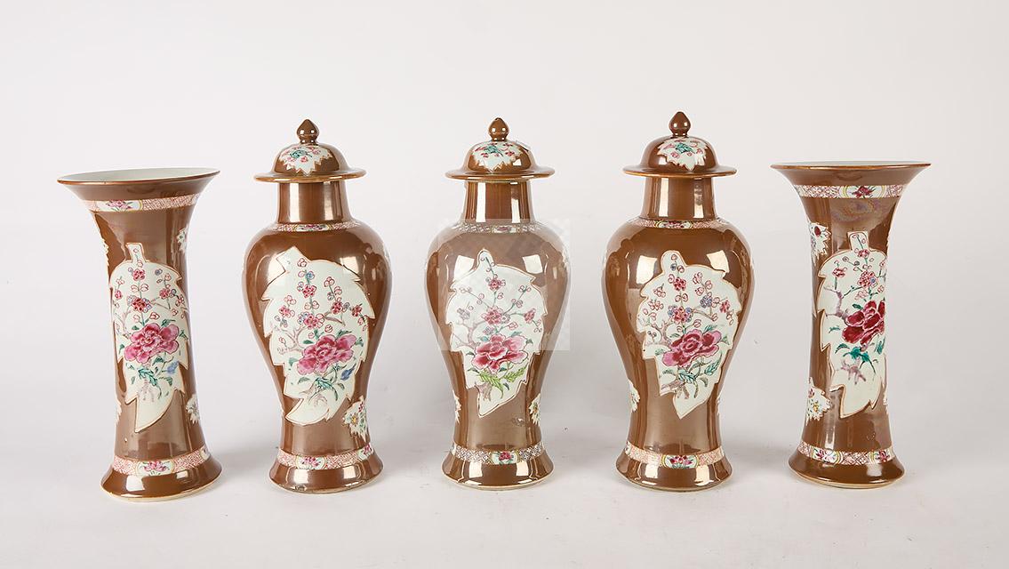Garniture en porcelaine à décor famille rose sur fond capucin composé de trois vases couvert ( H 28.5 cm ), deux vases cornet ( H 24 cm )