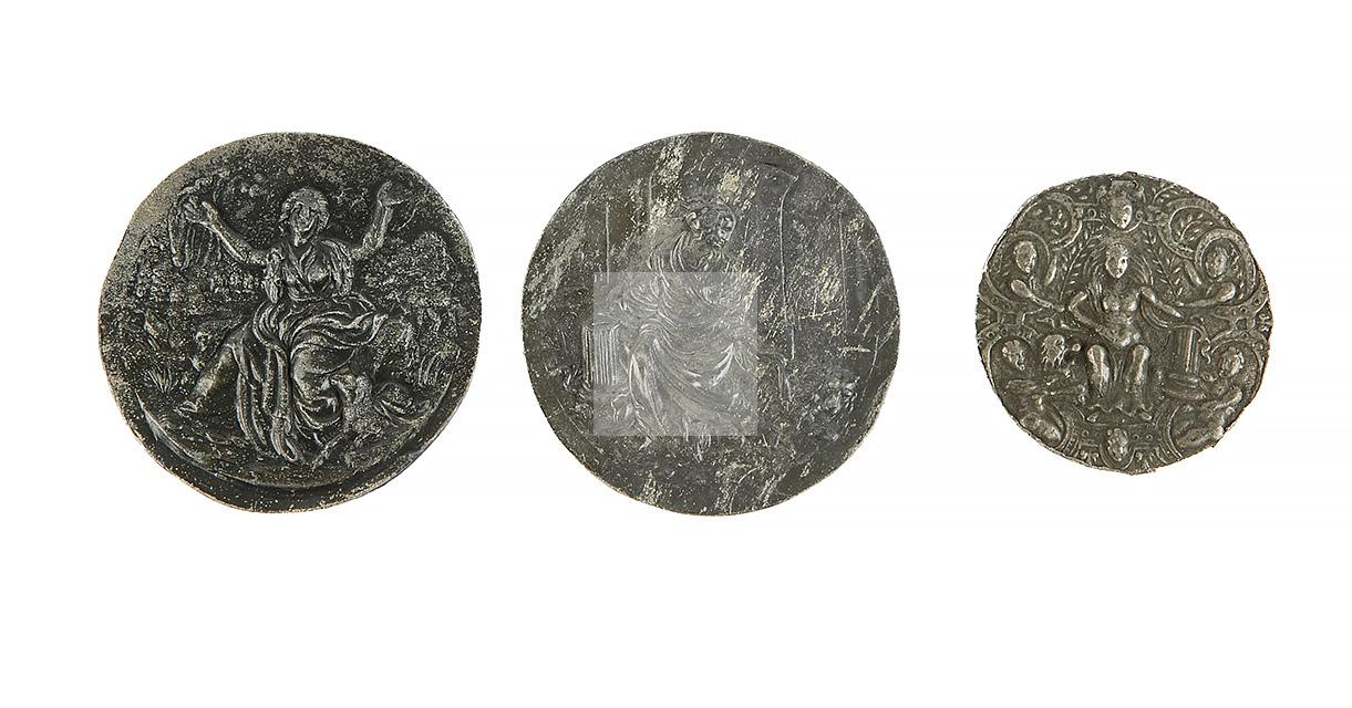 133 Deux médaillons en plomb estampées et ciselées représentants la Patience et la Force, par Peter Flötner (1490 – 1546).