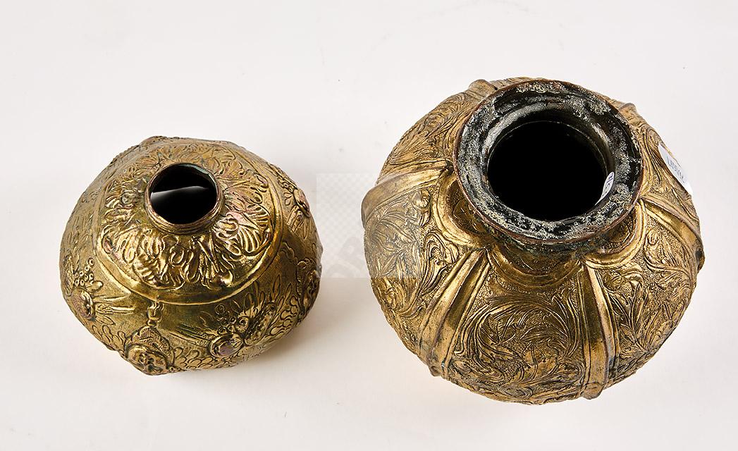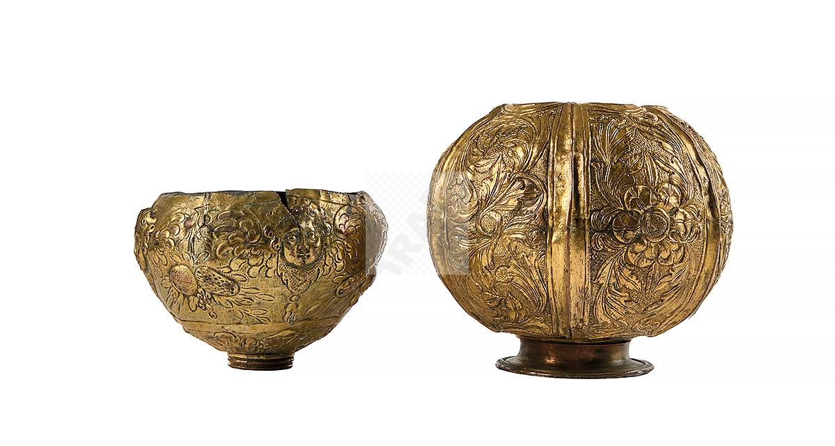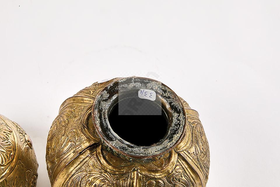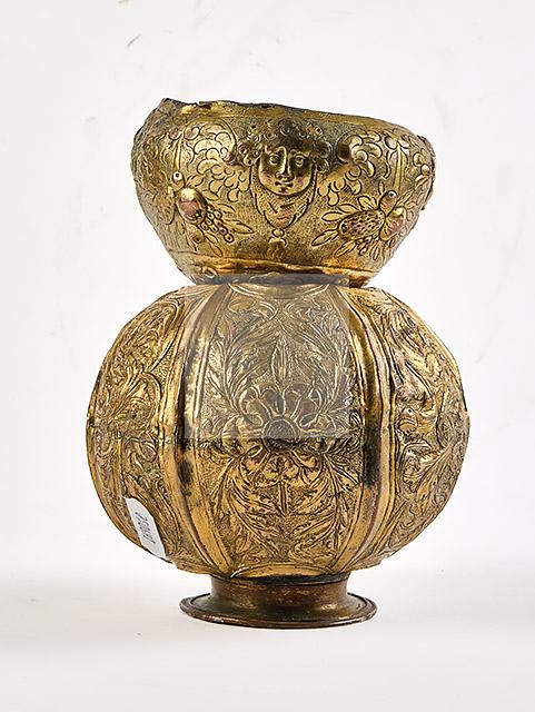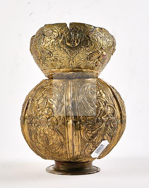 on joint un élément de nœud en cuivre repoussé et doré à décor de tête d’angelots.
