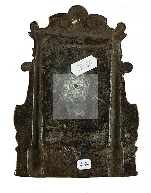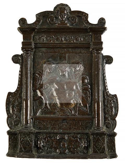 149 Plaque de baiser de Paix en bronze à patine brune représentant la Lamentation au Tombeau. Dans un encadrement architecturé avec fronton orné d’une tête d’angelot.