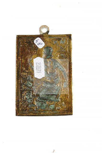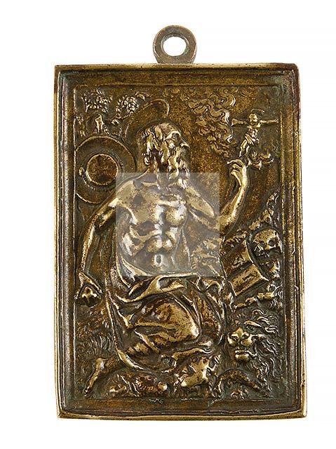 150 Plaquette en bronze représentant saint Jérôme. Il est à demi vêtu et agenouillé, de profil à droite, tenant un crucifix de sa main gauche levée ; à ses pieds, un livre, une tête de mort, le lion ; bélière.