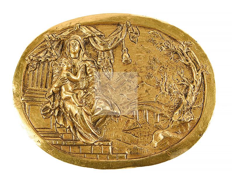 157 Plaquette en bronze de forme ovale et doré représentant la Vierge à l’Enfant et le repos pendant la Fuite en Égypte ; paysage avec pont, montagne et arbre.