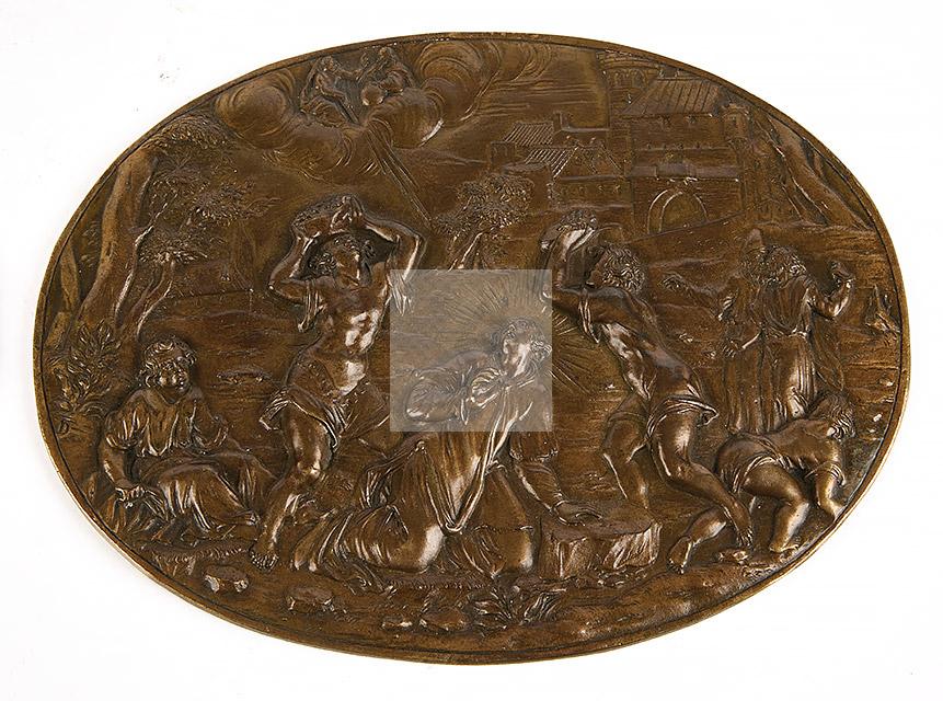 164 Paire de plaques ovales en bronze représentant la Conversion de Paul et la Lapidation d’Étienne.