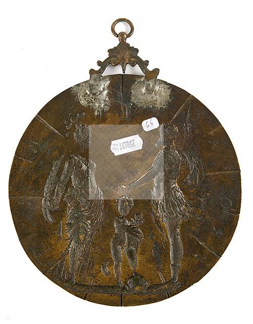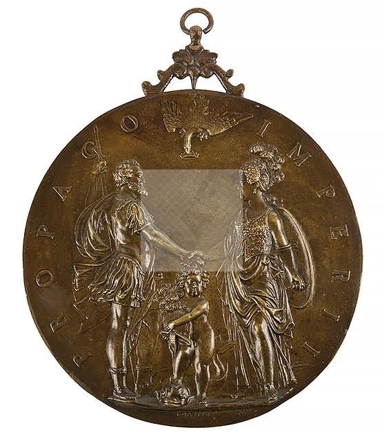 169 Grand médaillon en bronze figurant Henri IV, représenté en Mars, en armure romaine, une épée à la ceinture et un bâton dans la main gauche, serre la main de Marie de Medicis. La Reine est figurée en Minerve, un bouclier sur le bras gauche et l’égide autour du cou. Un aigle porte une couronne au-dessus du Dauphin, qui a posé le pied droit sur la tête d’un dauphin et tient le casque de son père sur son genou. Un bouclier et une pique gisent au sol derrière lui.