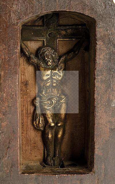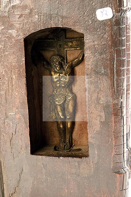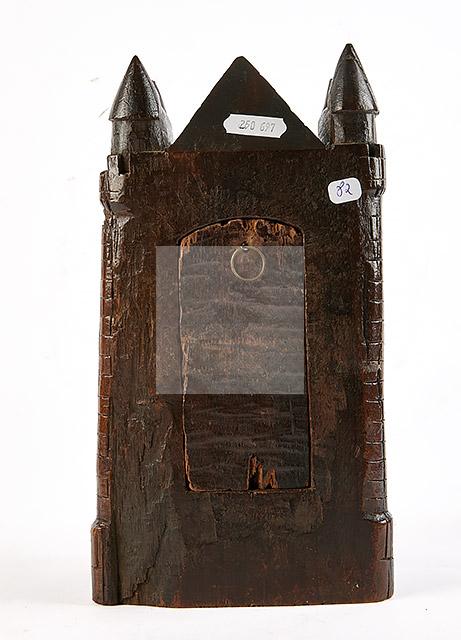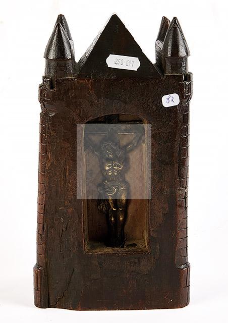 185 La Tour du Temple en bois sculpté en ronde-bosse avec ouverture à l’arrière renfermant un Crucifix en laiton estampé.