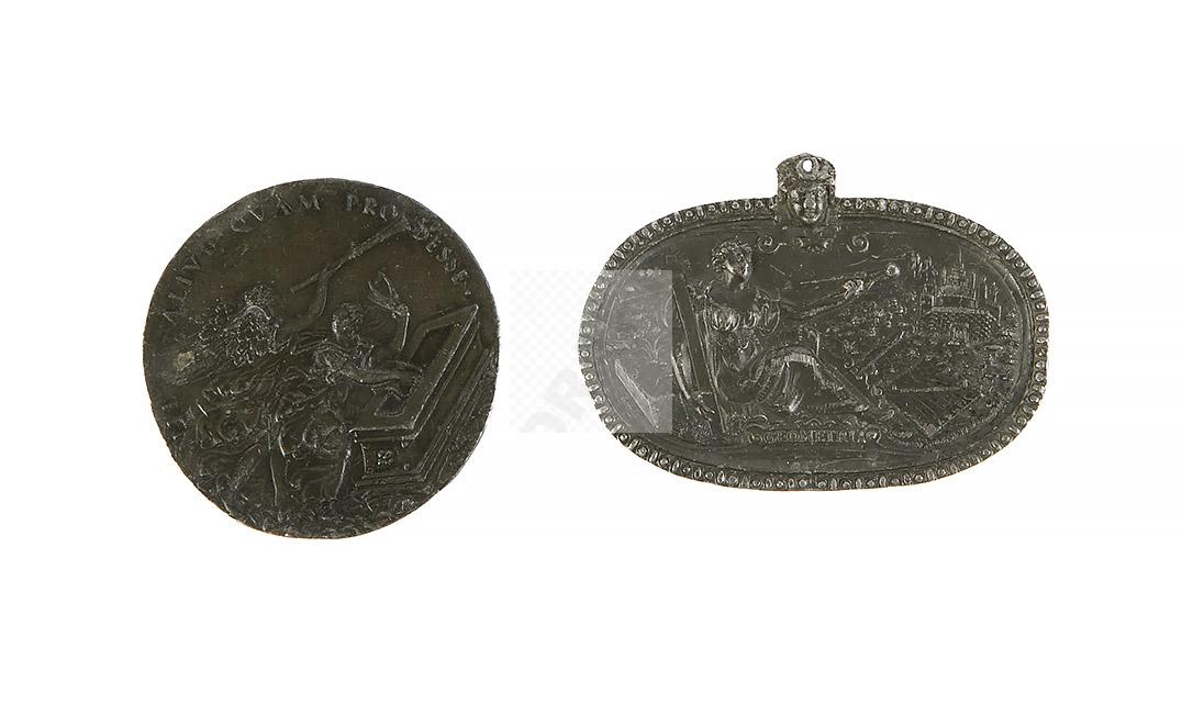 198 Médaillon ovale en étain estampé représentant la Géométrie d’après Caspar Enderlin (1560-1633).