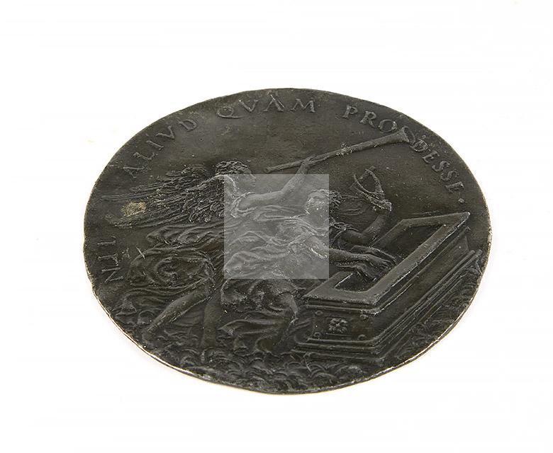 on joint un médaillon en étain estampé représentant une allégorie (de l’architecture?) inscriptions NIHIL ALIUD QUAM PRODESSE (Car je ne désire rien d’autre que d’être utile)