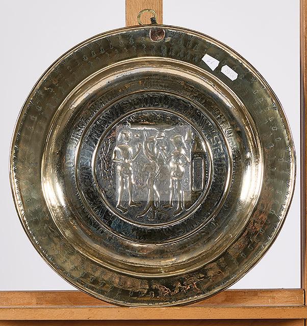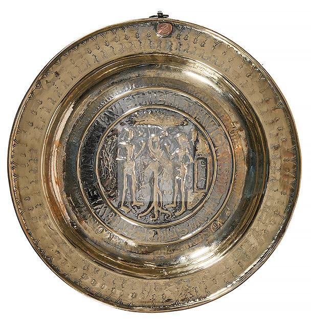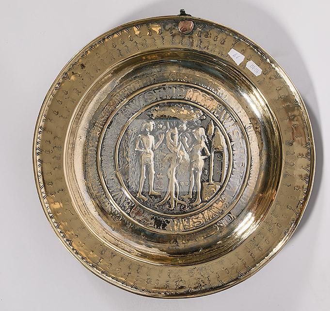 Lot n°202 - 202 Plat de quête en laiton à décor en semi-relief figurant Adam et Eve au jardi