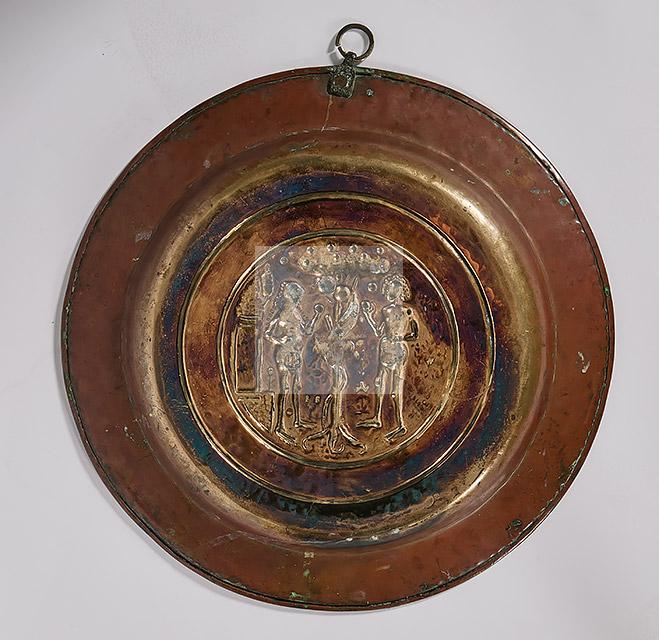 202 Plat de quête en laiton à décor en semi-relief figurant Adam et Eve au jardin d’Eden.