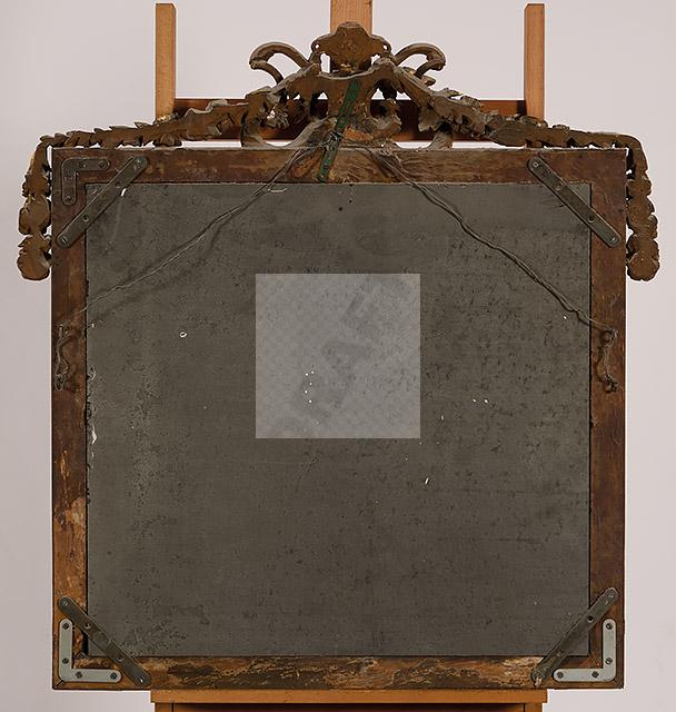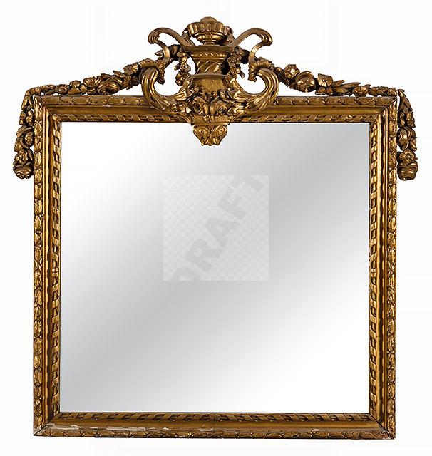 215 Miroir en bois sculpté, stuqué et doré, le fronton à décor de vase sur pièdouche d’où émergent des guirlandes de fruits