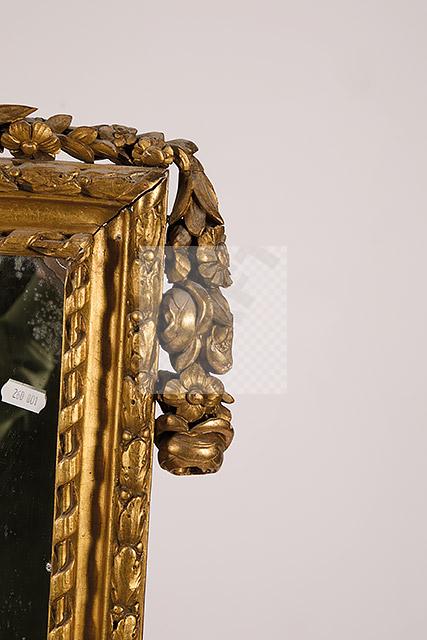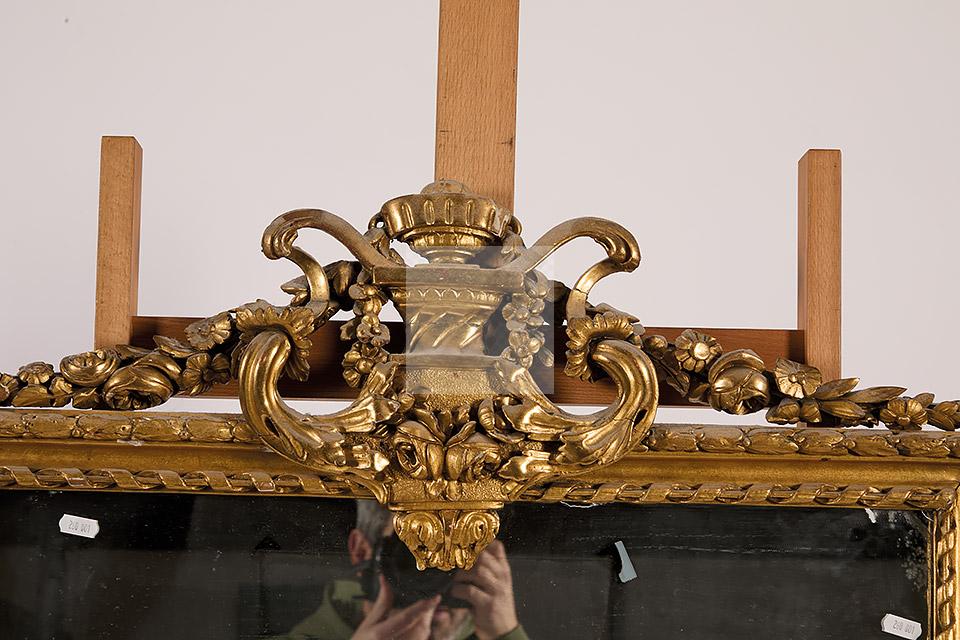 Lot n°215 - 215 Miroir en bois sculpté, stuqué et doré, le fronton à décor de vase sur pièdo