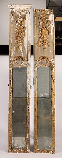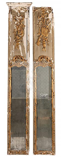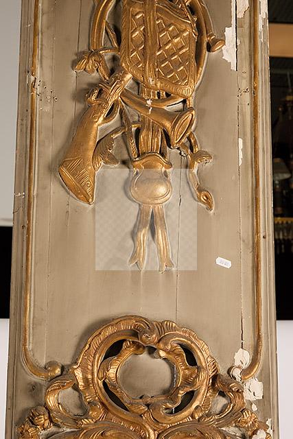 217 Deux éléments de boiserie en bois sculpté et doré à décor de trophée d’arme,instrument de musique, châpeau, corbeille de fleurs, noeud et ruban, les parties inférieures formant miroir