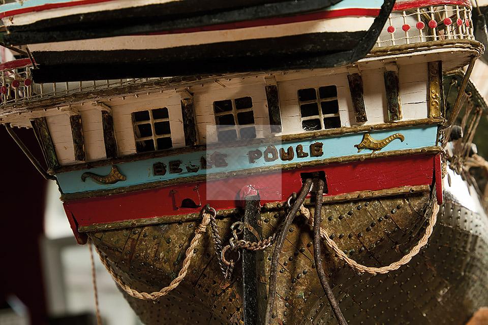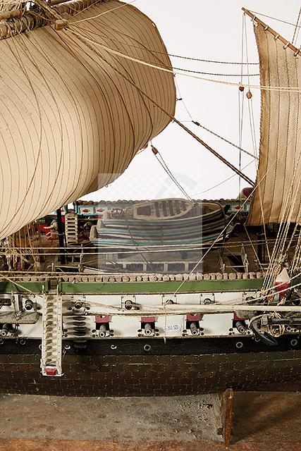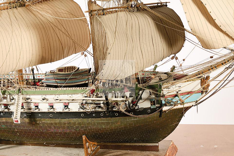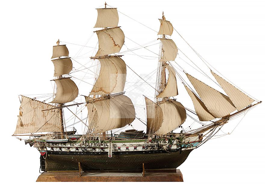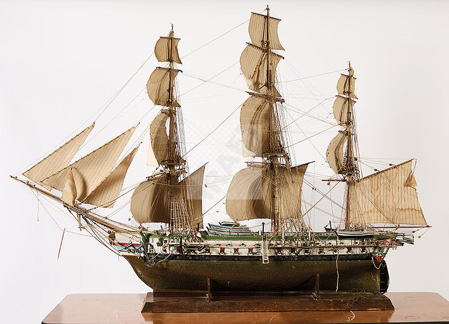 223 Bis Importante maquette de trois mâts en bois polychrome richement détaillé. La coque bardée de cuivre.