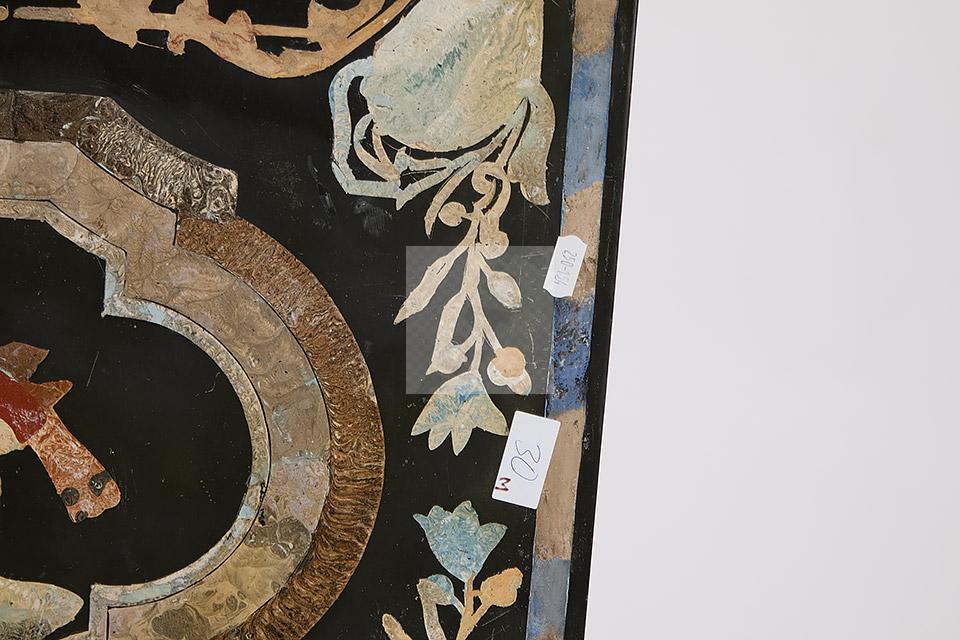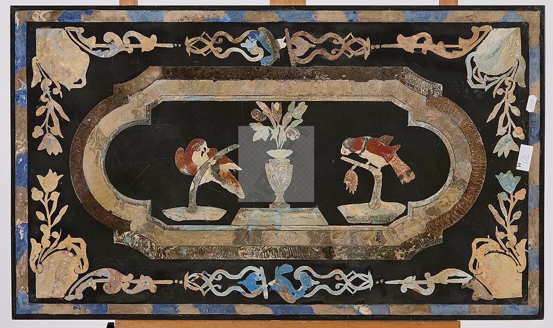 Lot n°240 - 240 Plateau en marbre et scagliole à décor polychrome de perroquets branchés, va