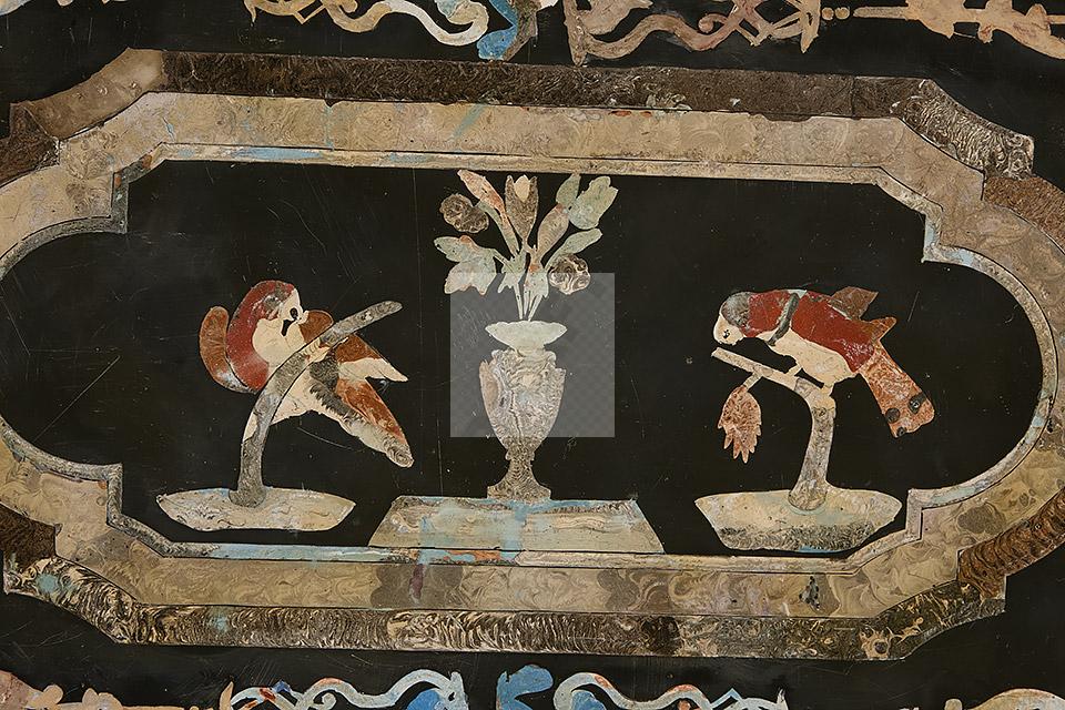 240 Plateau en marbre et scagliole à décor polychrome de perroquets branchés, vase fleuri et motifs stylisés