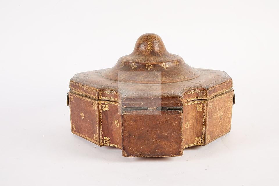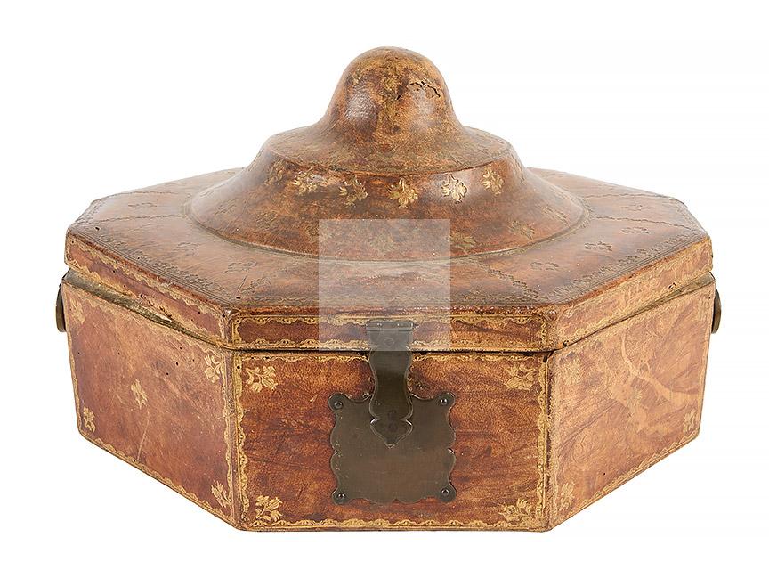 241 Boite destinée à accueillir une soupière et une louche en argent, en cuir havane à décor doré au petits fers de fleurettes et motifs stylisés, garniture de fer forgé aux entrées de serrures et poignées de transport