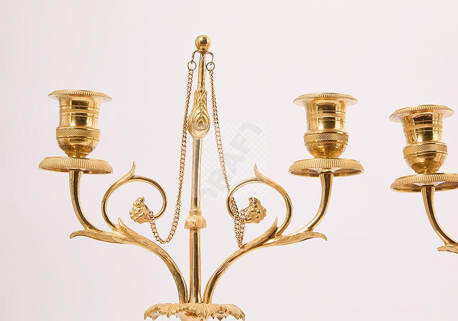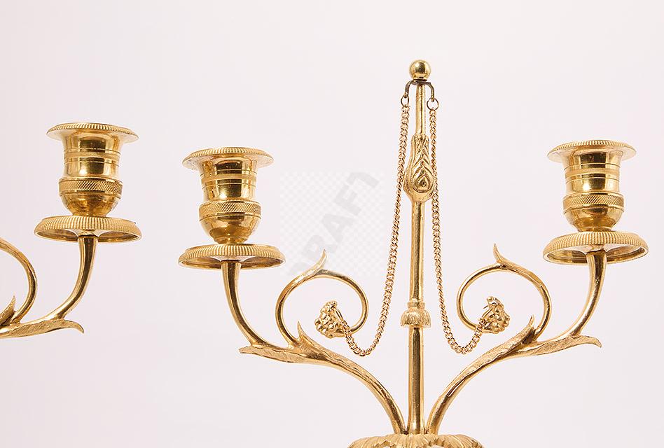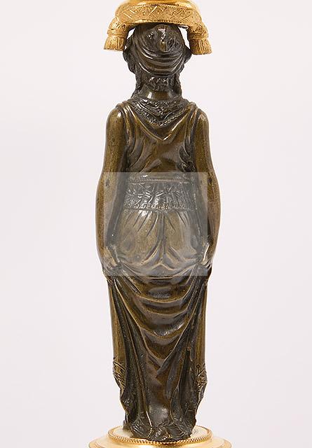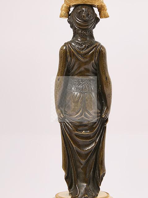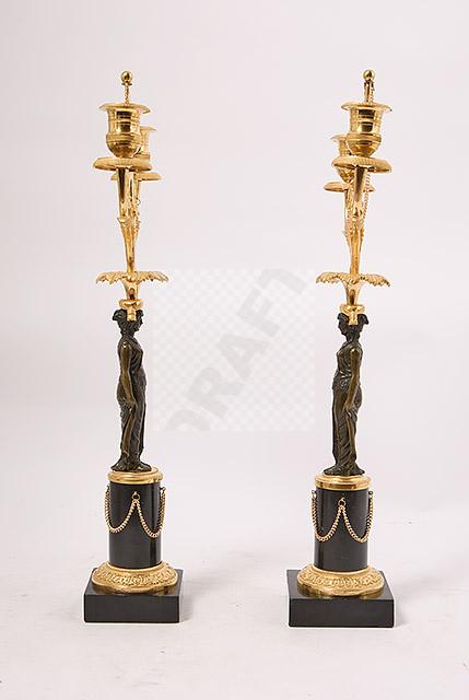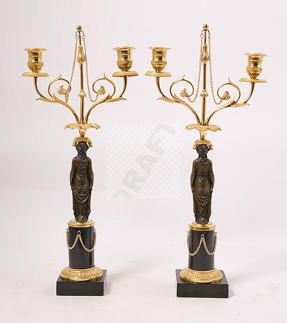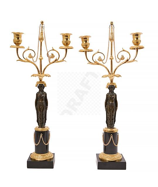 246 Paire de candélabres à deux bras de lumières en bronze patiné, bronze ciselé etdoré et marbre noir à décor d’athéniennes à chapiteaux ioniques stylisés d’où émergent les bras de lumière.