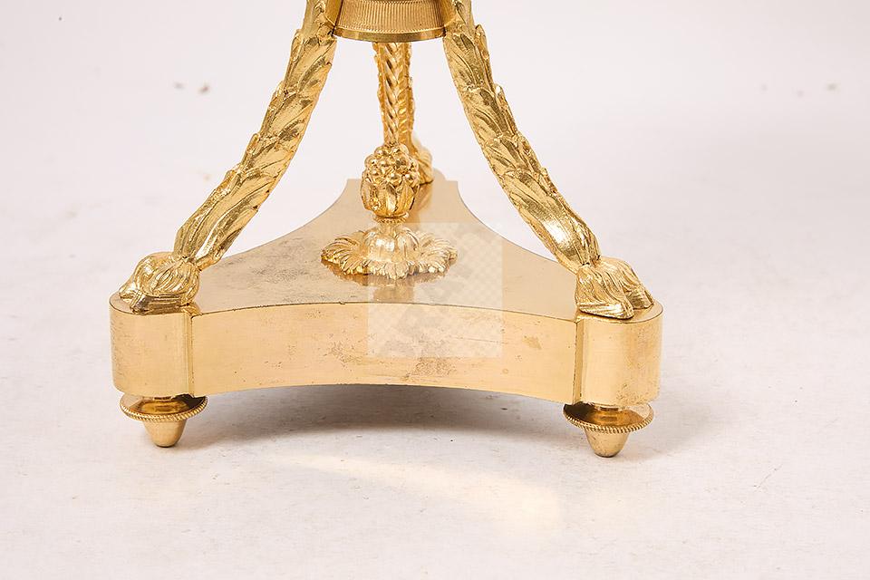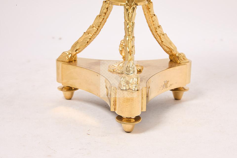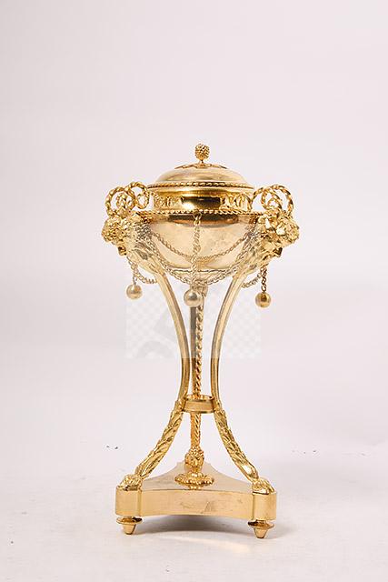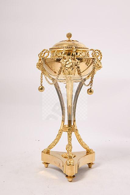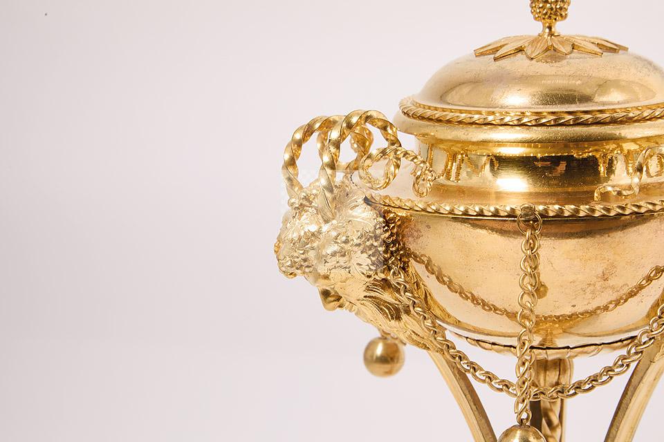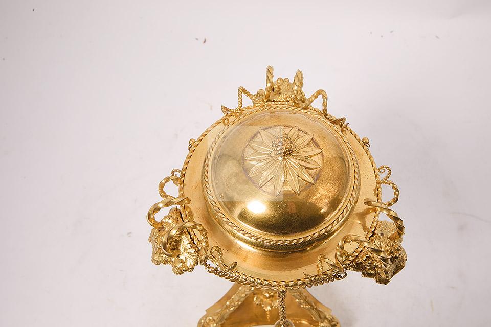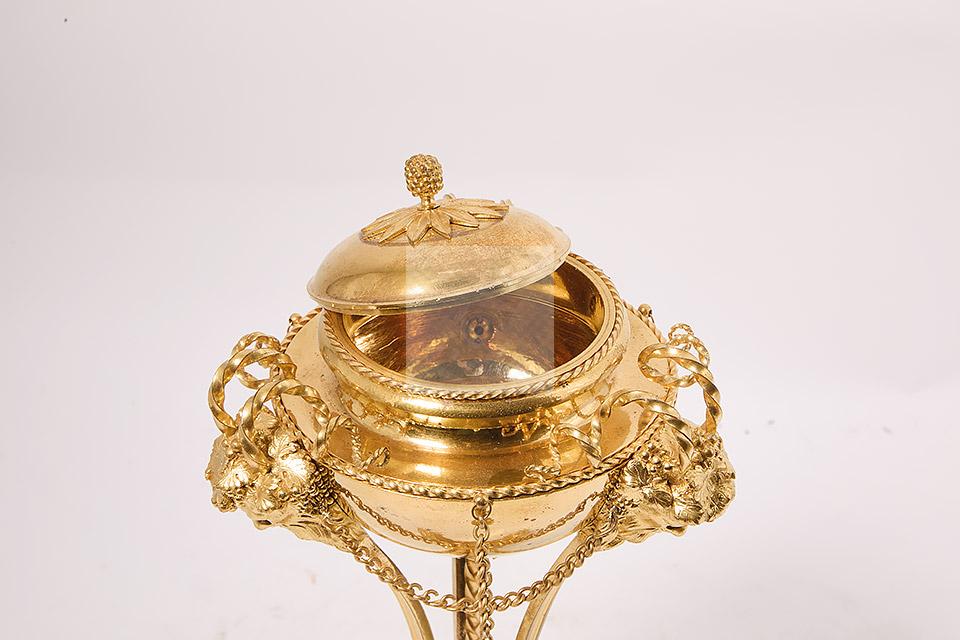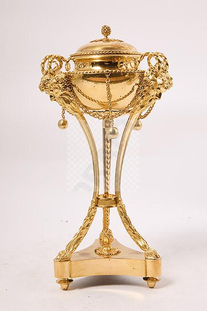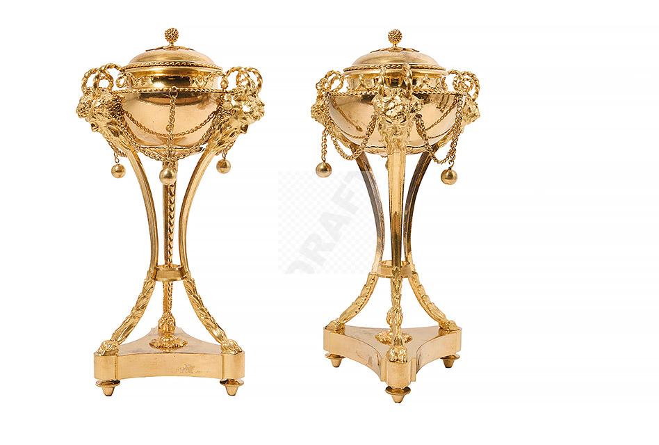 257 Paire de vases couverts en forme d’athénienne en bronze ciselé et doré à décor de têtes de faune, frises de perles, motifs feuillagés, chainettes et perles de bronze, piètement tripode à terminaison en patte de bélier, bases évidées et pieds toupie