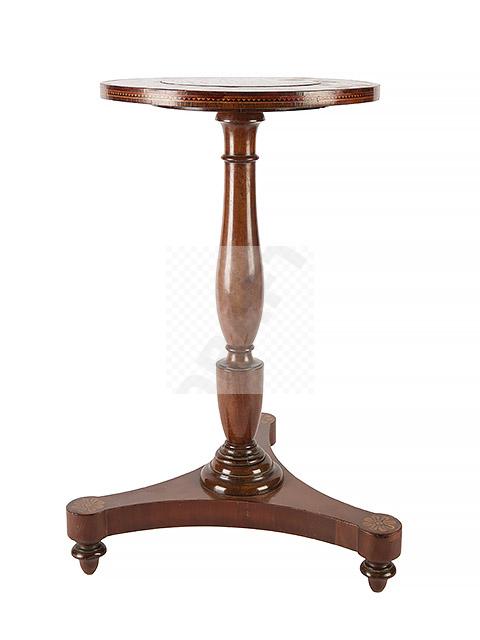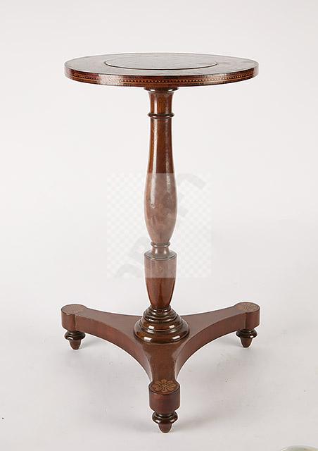 259 Petit guéridon en bois de placage marqueté d’enroulements, filets et motifs stylisés, fût en balustre et base évidé en acajou à décor marqueté de rosaces