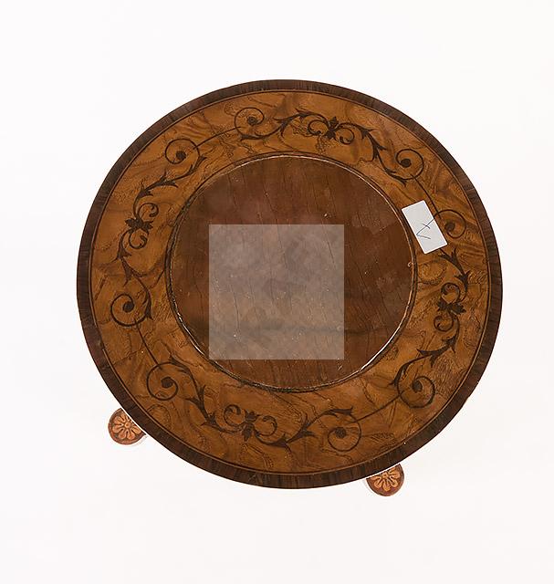 Lot n°259 - 259 Petit guéridon en bois de placage marqueté d’enroulements, filets et motifs