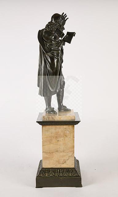 Sculpture en bronze patiné, socle quadrangulaire en marbre jaune de Sienne souligné de frises feuillagées