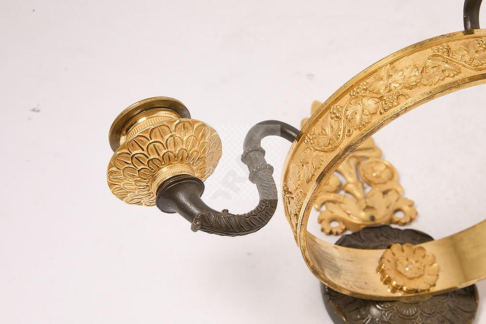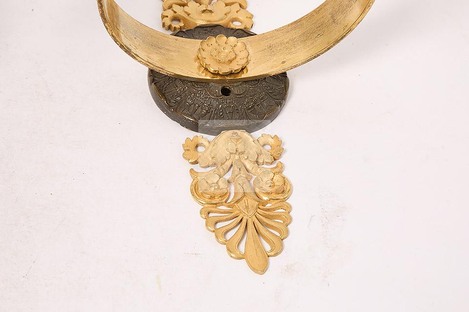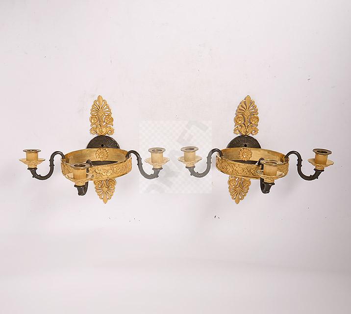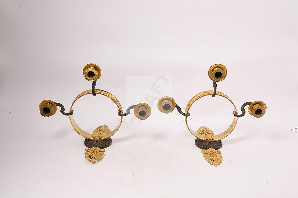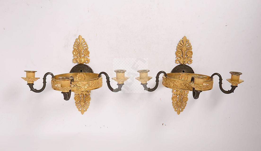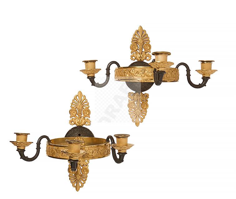 Paire d’appliques à trois bras de lumières à décor de couronnes de pampes et grappes de raisins, les platines à terminaison à décor ajouré de palmettes