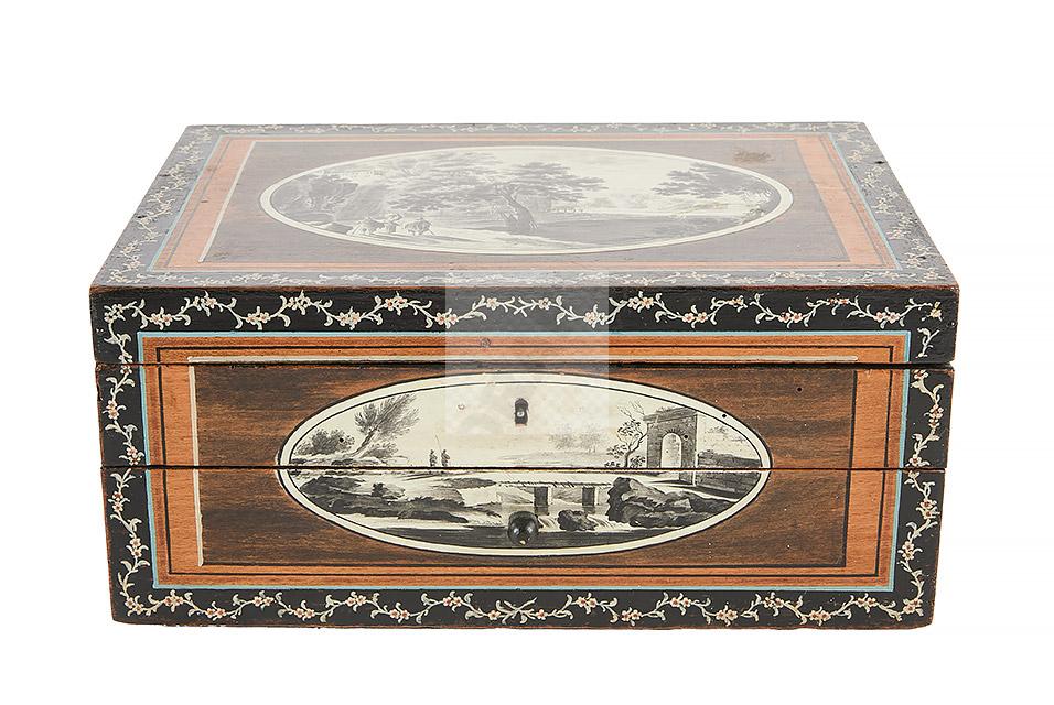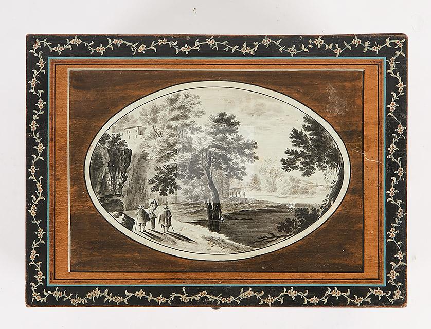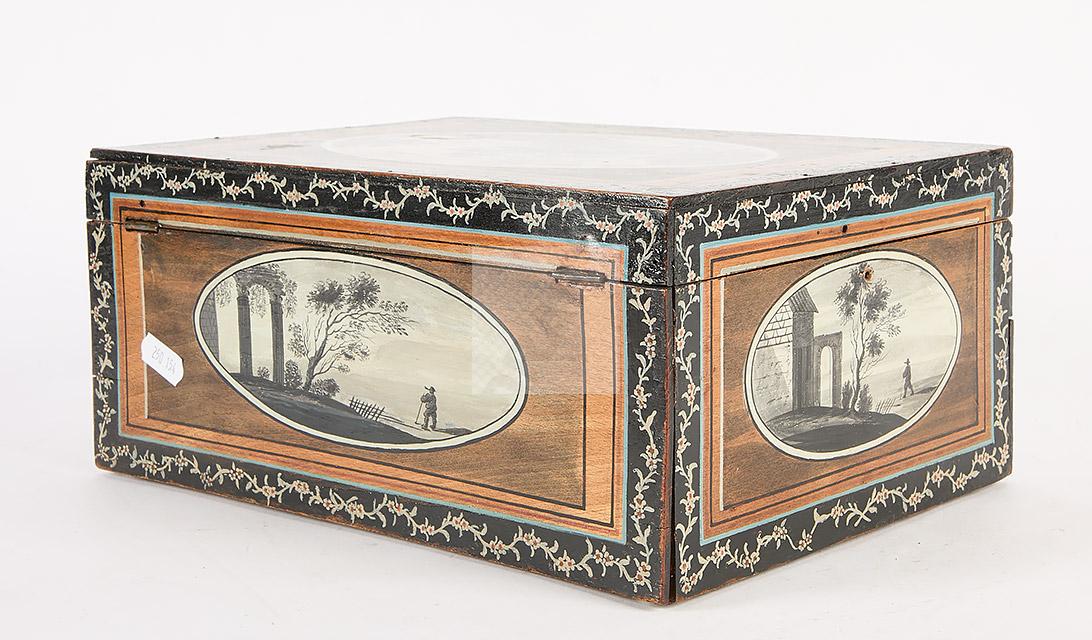 271 Boite à décor réservé en grisaille de personnages dans des paysages, dans des encadrements de filets et guirlandes fleuries polychromes, ouvre à un abattant et un tiroir en façade