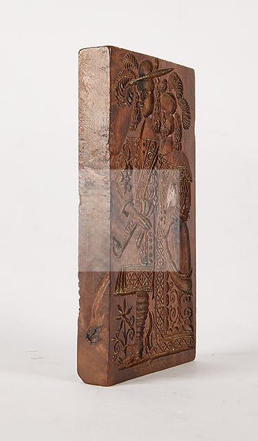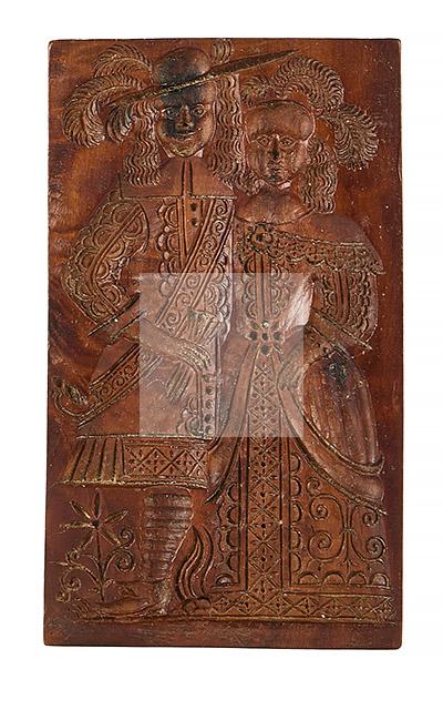288 Matrice de moule en noyer sculpté à décor d’un couple d’élégant en habit du XVIIème siècle