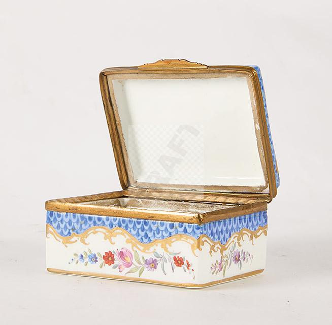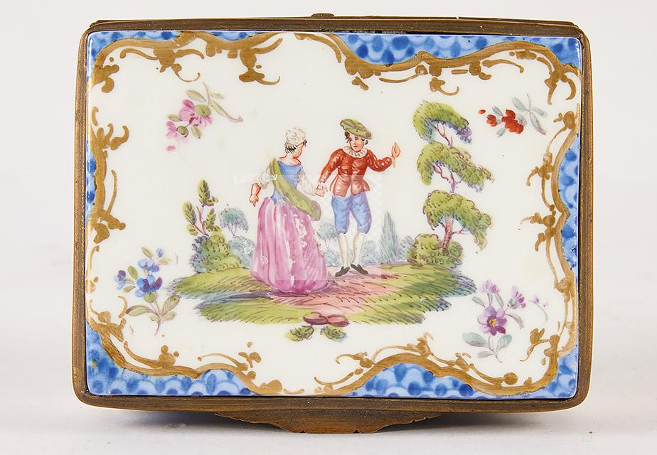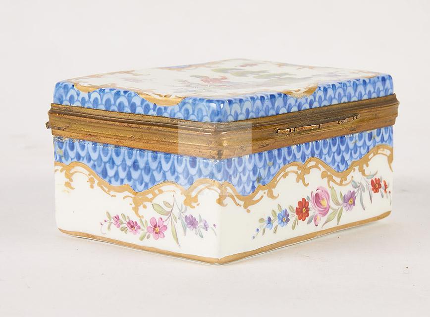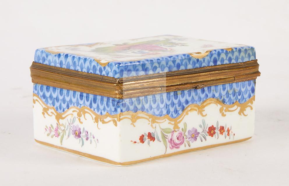 Petite boite en porcelaine polychrome à réhaut doré à décor de scène galante et jetée de fleurs, charnière en laiton