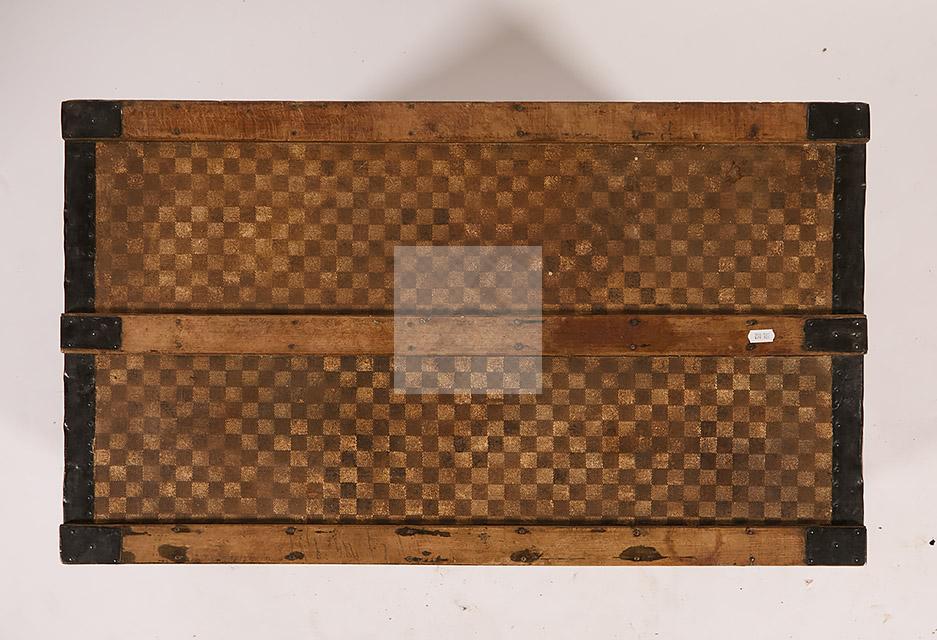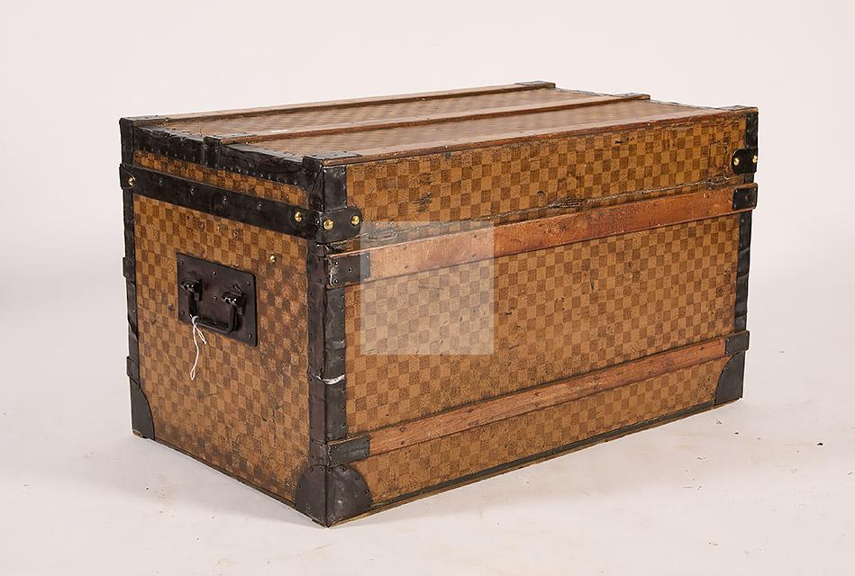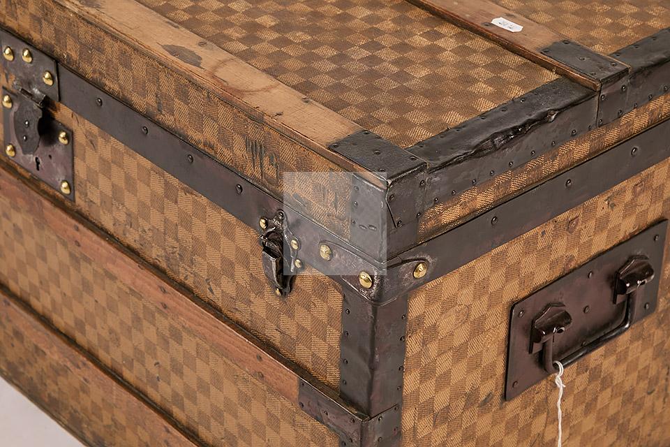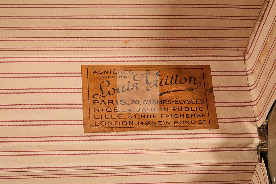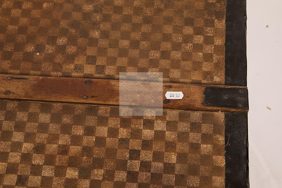 Malle de voyage en toile enduite à motif damier et armature en acier noirci. Intérieur garni de tissu beige rayé rouge et étiquettes Louis Vuitton mentionnant les boutiques de Paris, Nice, Lille et Londres, ainsi qu’une seconde mentionnant la boutique rue Faidherbe à Lille.