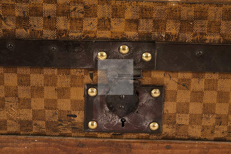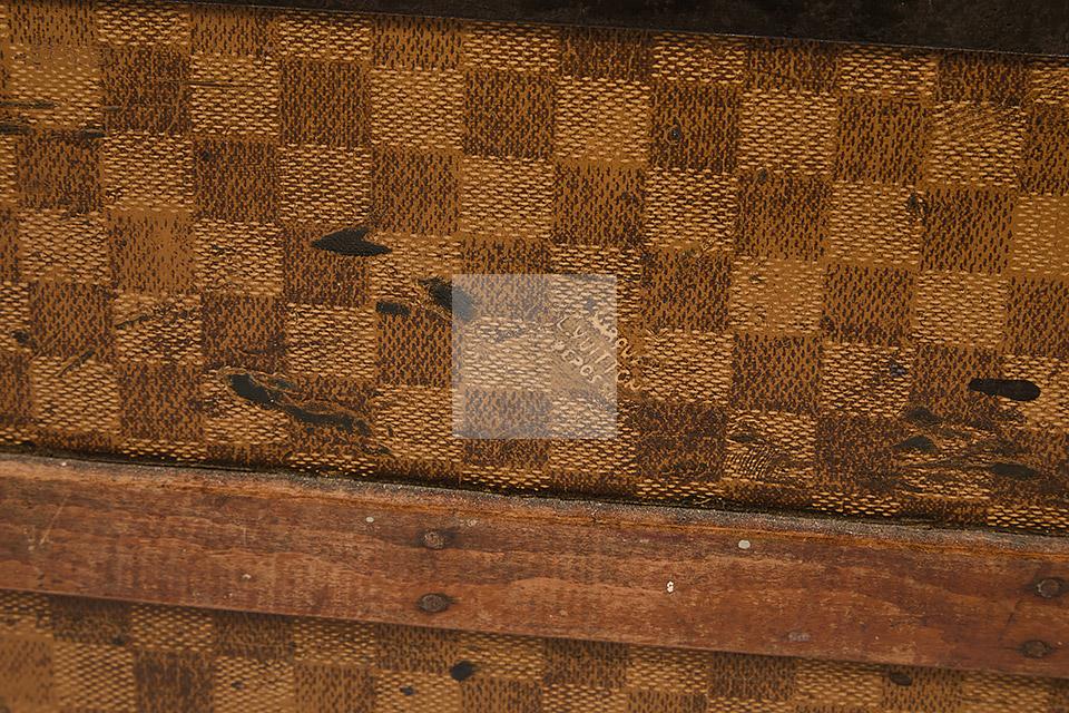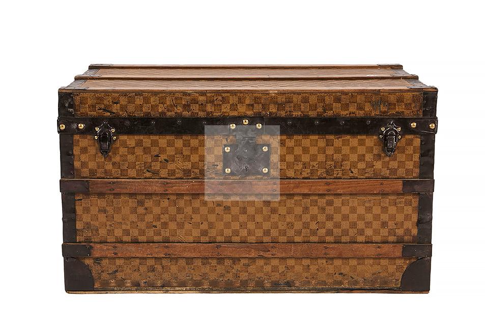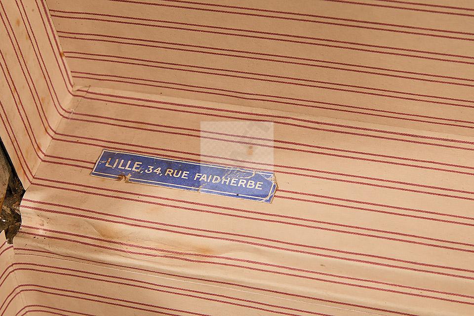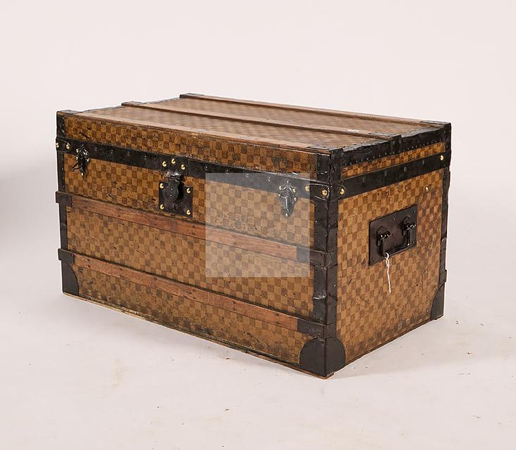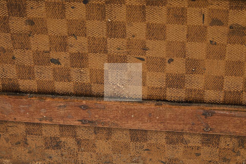 Malle de voyage en toile enduite à motif damier et armature en acier noirci. Intérieur garni de tissu beige rayé rouge et étiquettes Louis Vuitton mentionnant les boutiques de Paris, Nice, Lille et Londres, ainsi qu’une seconde mentionnant la boutique rue Faidherbe à Lille.