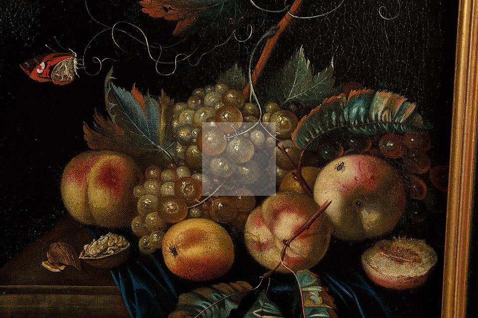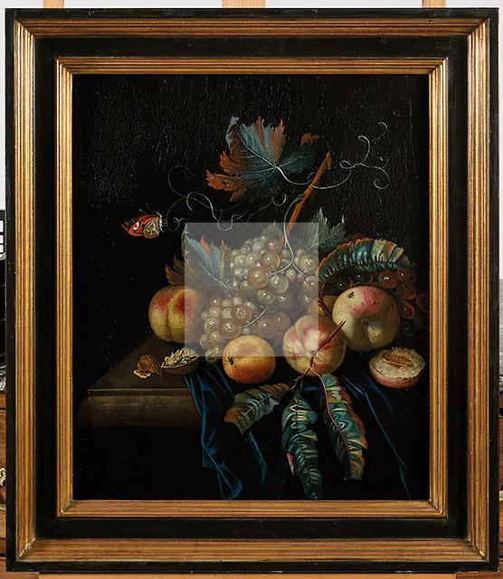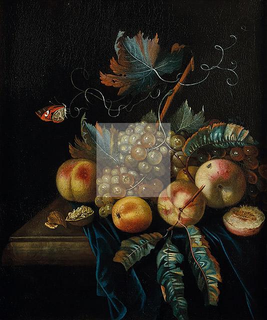 Nature Morte aux pêches et raisins sur un entablement, avec un papillon
