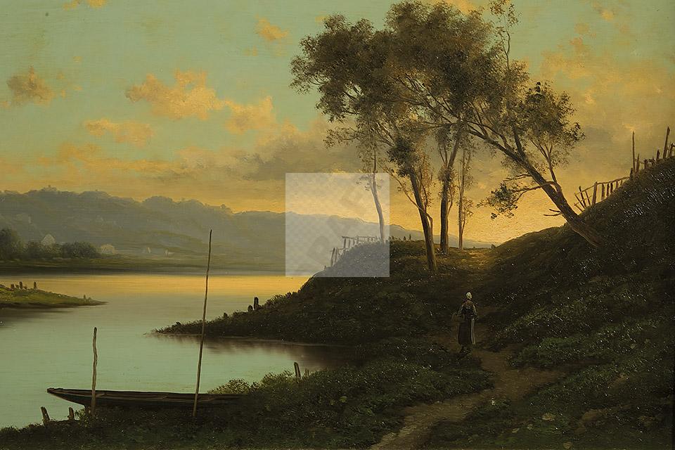 Paysage animé au soleil couchant